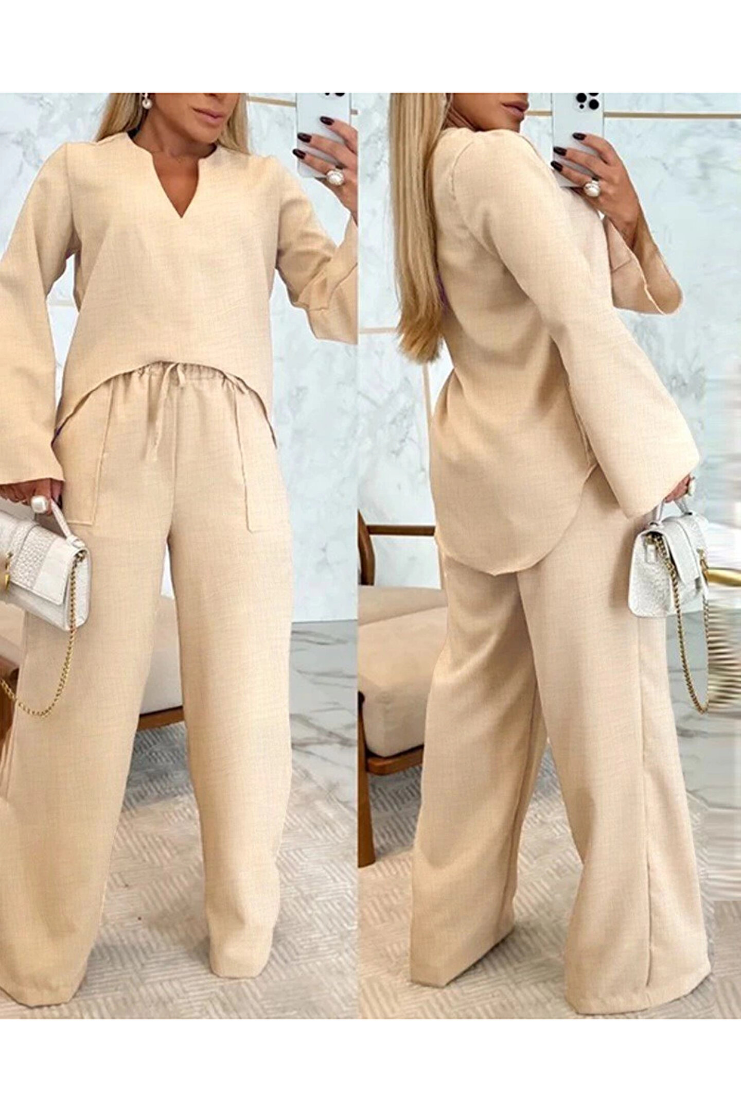 goopall Kadın Uzun Kollu V Yakalı Keten Bluz Bağcıklı Pantolon Ikili Takım