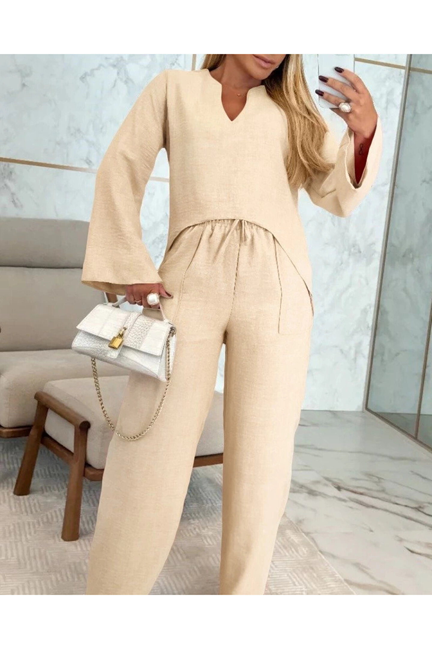 Kadın Uzun Kollu V Yakalı Keten Bluz Bağcıklı Pantolon Ikili Takım