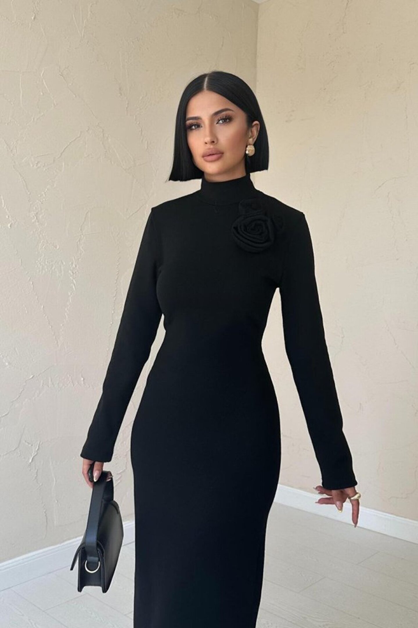 goopall munn collection Siyah Omzu Güllü Düz Elbise