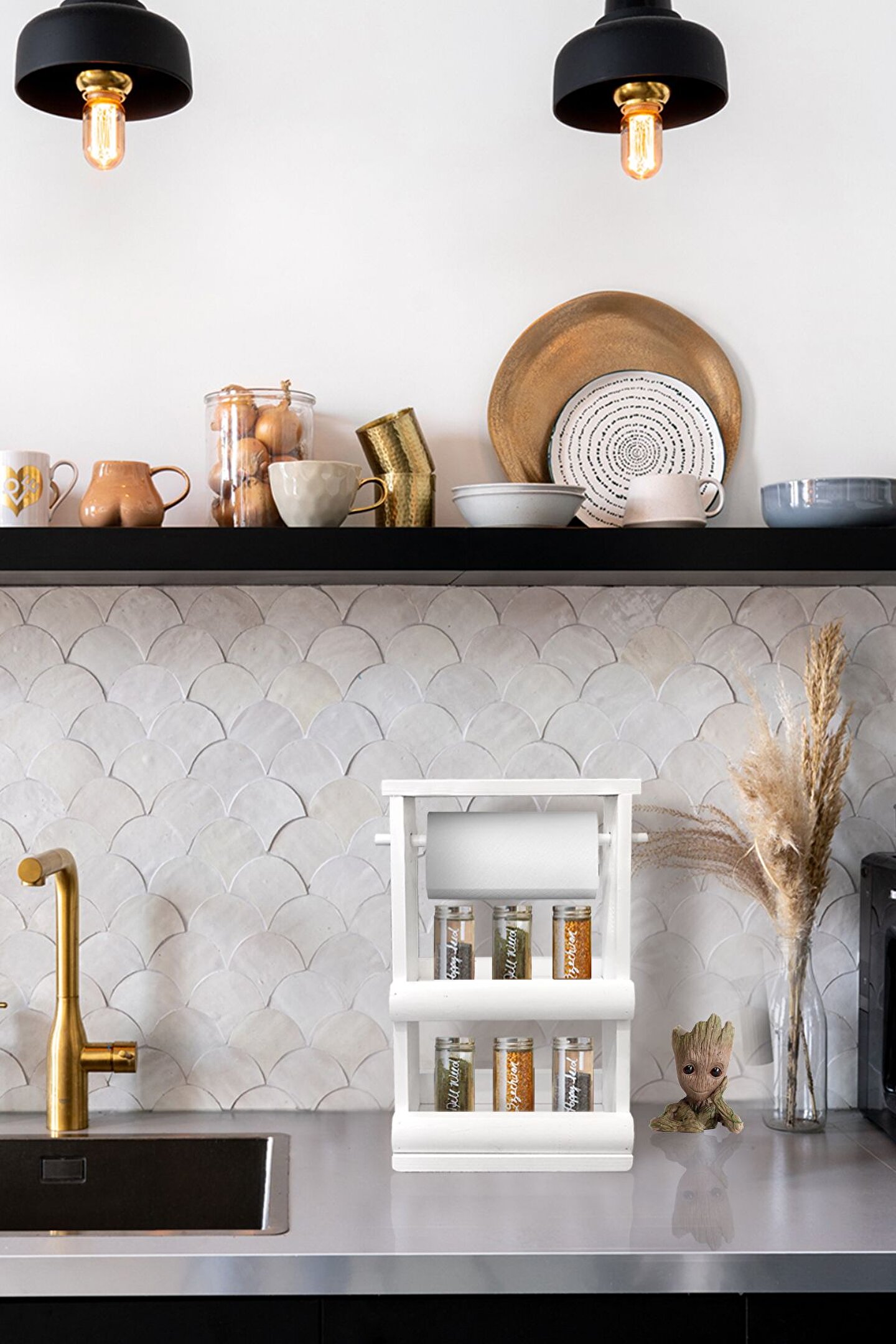 Ahşap Baharatlık Ve Kağıt Havlu Askılığı Beyaz