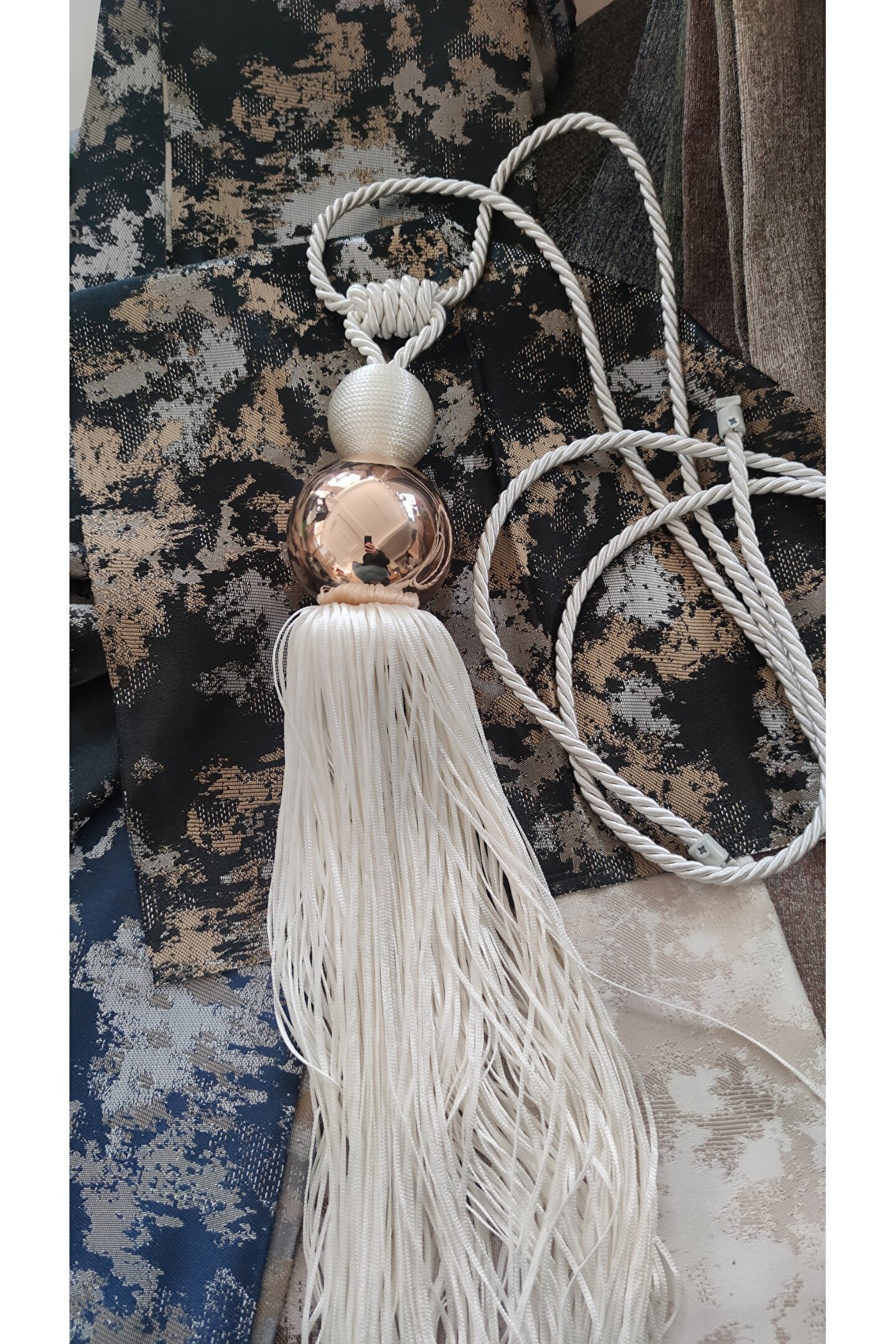Ürünümüzün Orta kukasi metal olup Gold rengindedir. ; Metal topun üstünde el sarım ekru renk küçük top vardır. ; Ürünümüzün kordon boyu 3 MT dir. ; Alt sacagi 50 cm dir. ; Korneje kolayca monte edilir. ; Ürün fiyatımız 2 adet için geçerlidir.;