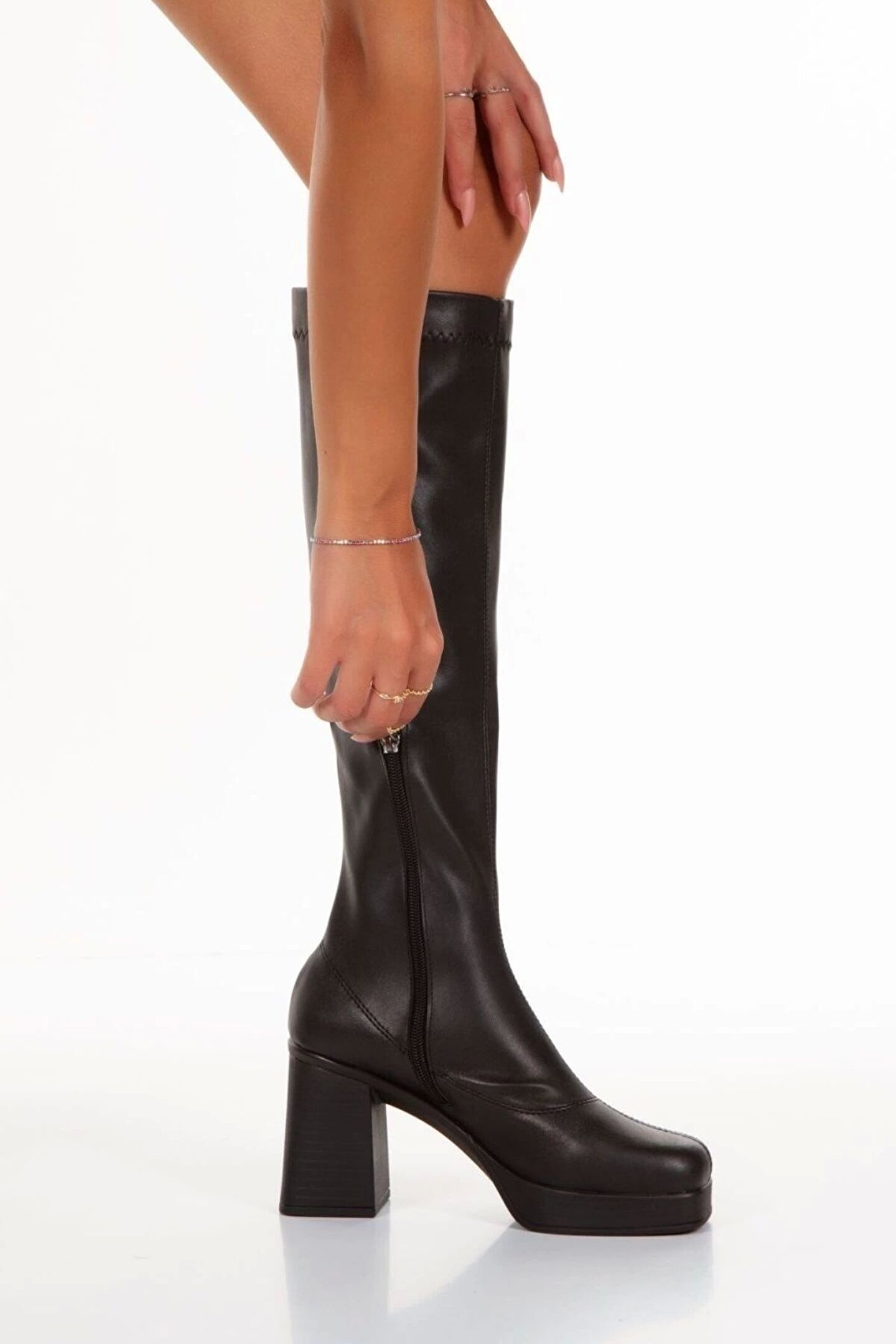 Diz altı Çizme Siyah cilt Fermuarlı Streç ve Esnek Çizme