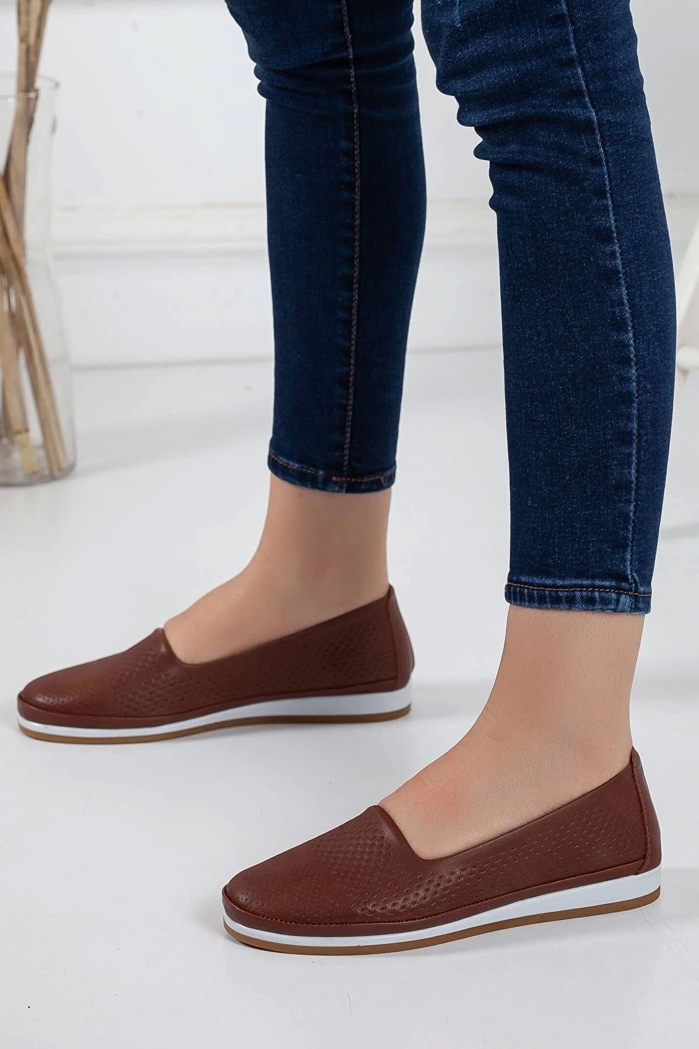 Hakiki Deri Kadın Günlük Ayakkabı Kahve Lazer Işlemeli