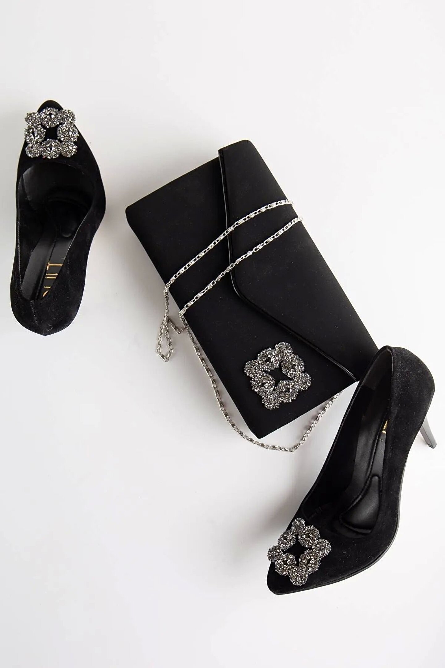 Kadın 7 Cm Topuklu Siyah Süet Taş Detaylı Çanta Kombinli Stiletto Takımı