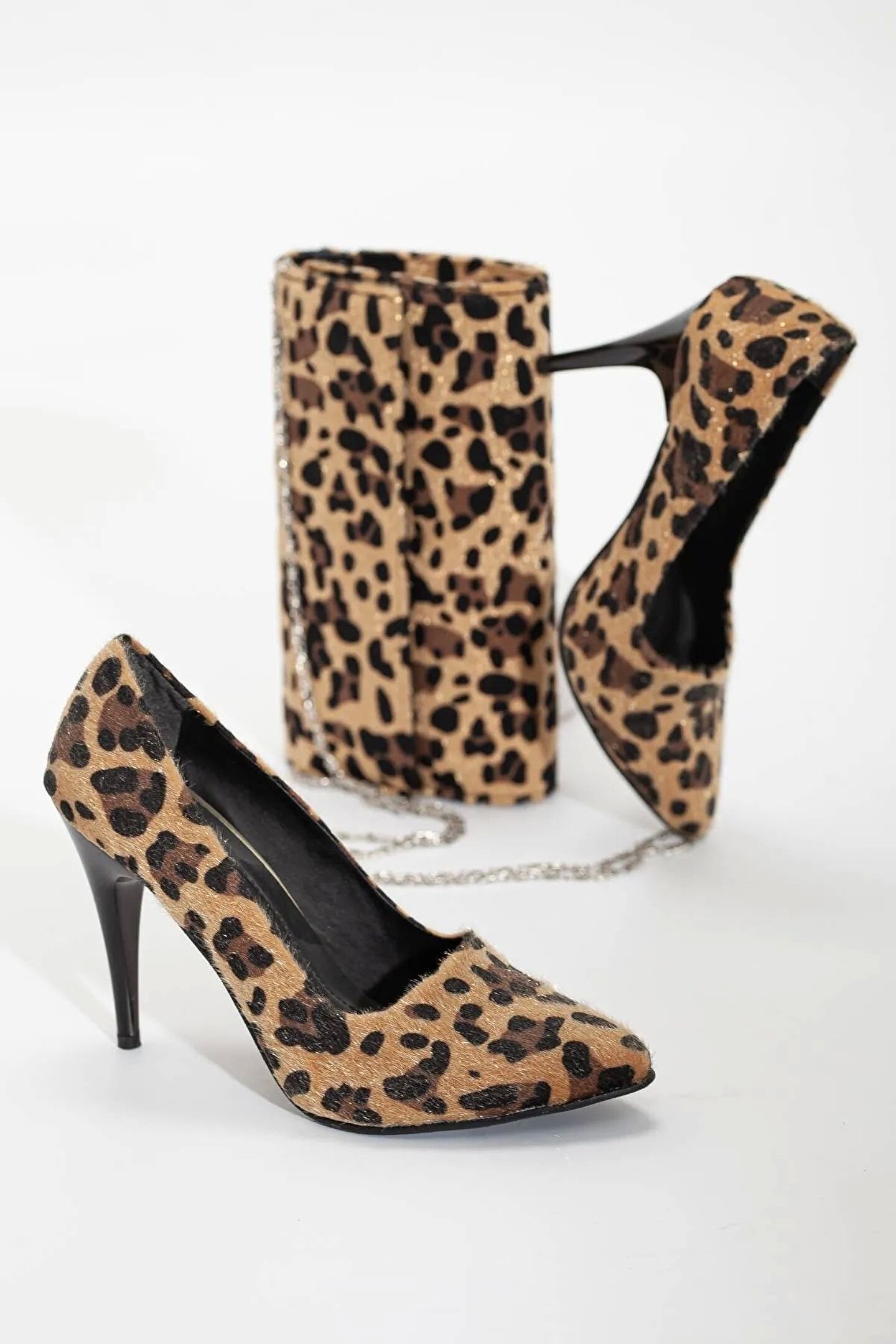 Kadın Ince Yüksek Topuklu Stiletto Ve Çanta Takımı 10 Cm Leopar Desenli