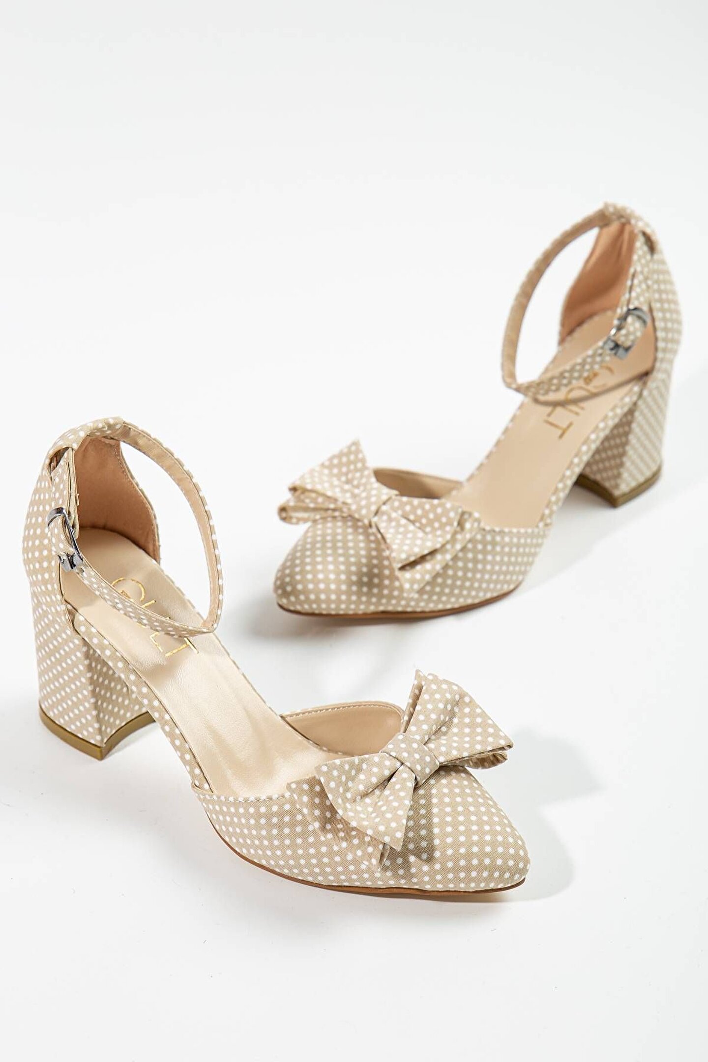 Kadın Kalın Kısa Topuklu Papyonlu Yazlık Ayakkabı Ten Puantiyeli