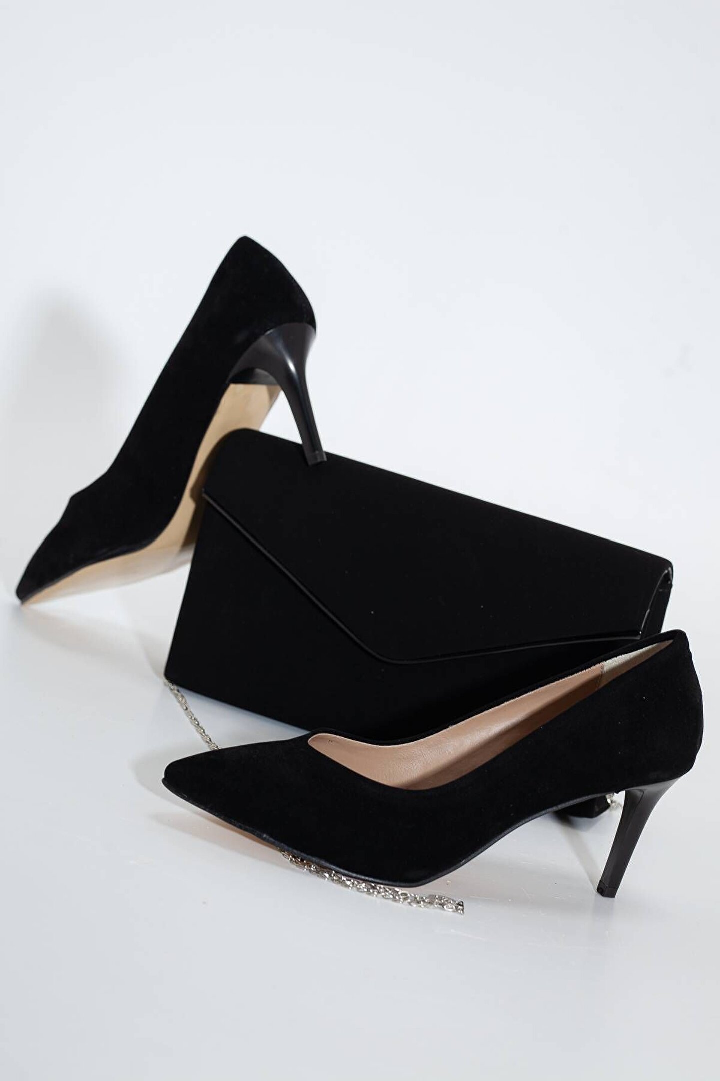 Stiletto 7 Cm Siyah Süet V Ağızlı Çanta Kombinli