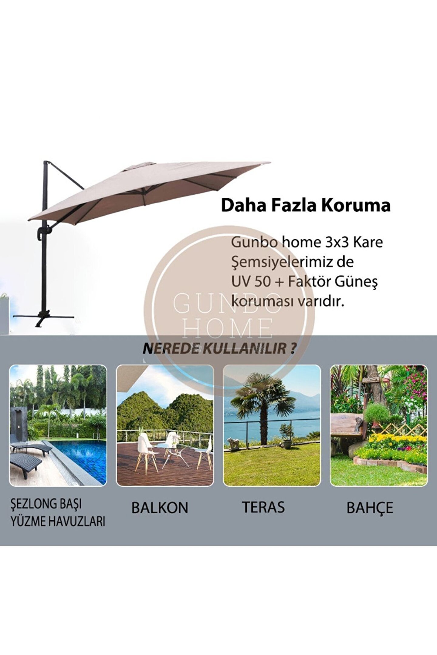 Genişlik 300 cm Yükseklik 260 cm Derinlik 300 cm Ağırlık 25 kg Malzeme Polyester Görselden daha açık bir renktedir(Ekru) ; GÜNEŞE GÖRE AÇI VERİLEBİLMEKTEDİR ; Dış mekanlarınızda size gölge ve serinlik sağlayacak yer tasarruflu birbirinden şık bu şemsiyeler Bej(EKRU) Renk Olarak Üretilmektedir. ; 8 Kol İskelet Vardır. ; ÇAP: 3X3 MT KARE Ebatında Paslanmaz Elektrostatik Özel Boya 300 G Suya Dayanıklı OXFORD Kumaşa Sahiptir. ; 1. Sınıf Kilit Aksamlar Kurulum Şeması İle Beraber Gönderilmektedir AYAK AĞIRLIĞI PAKETE DAHİL DEĞİLDİR ; 50×50 cm ölçülerinde 4 Cm kalınlığındaki istediğiniz bir doğal taş , mermer kestirerek yada hazır ağırlık bidonlarıyla kullanılabilir ;