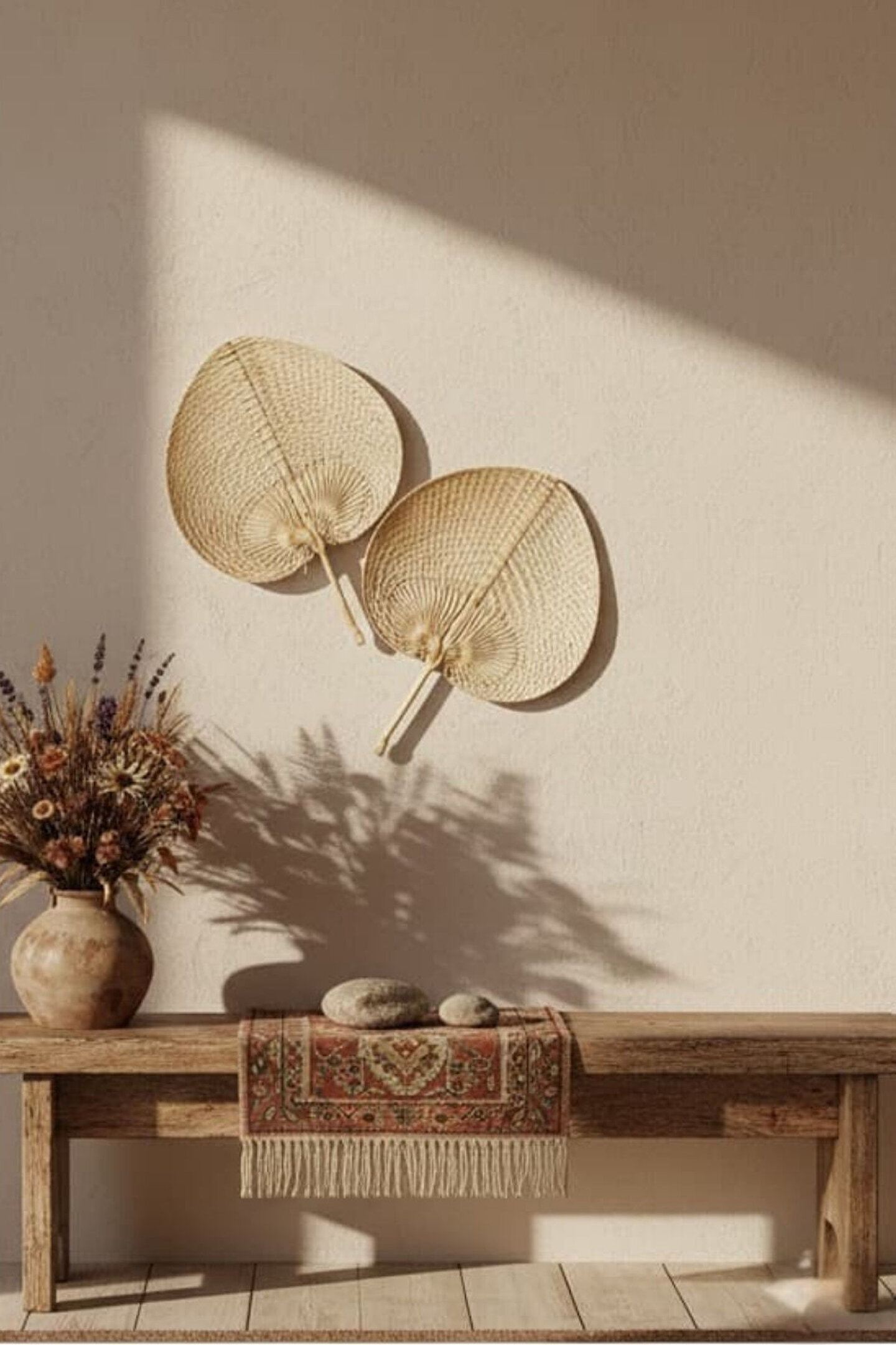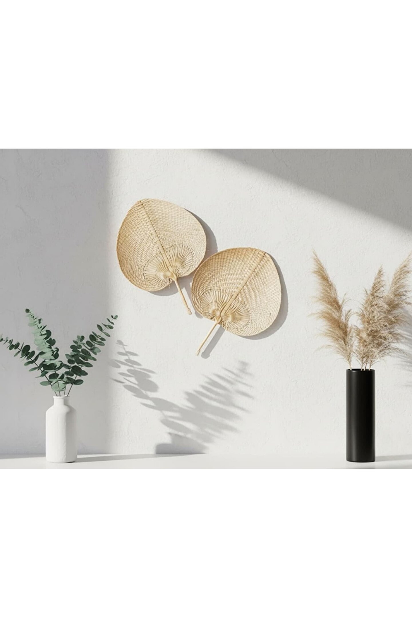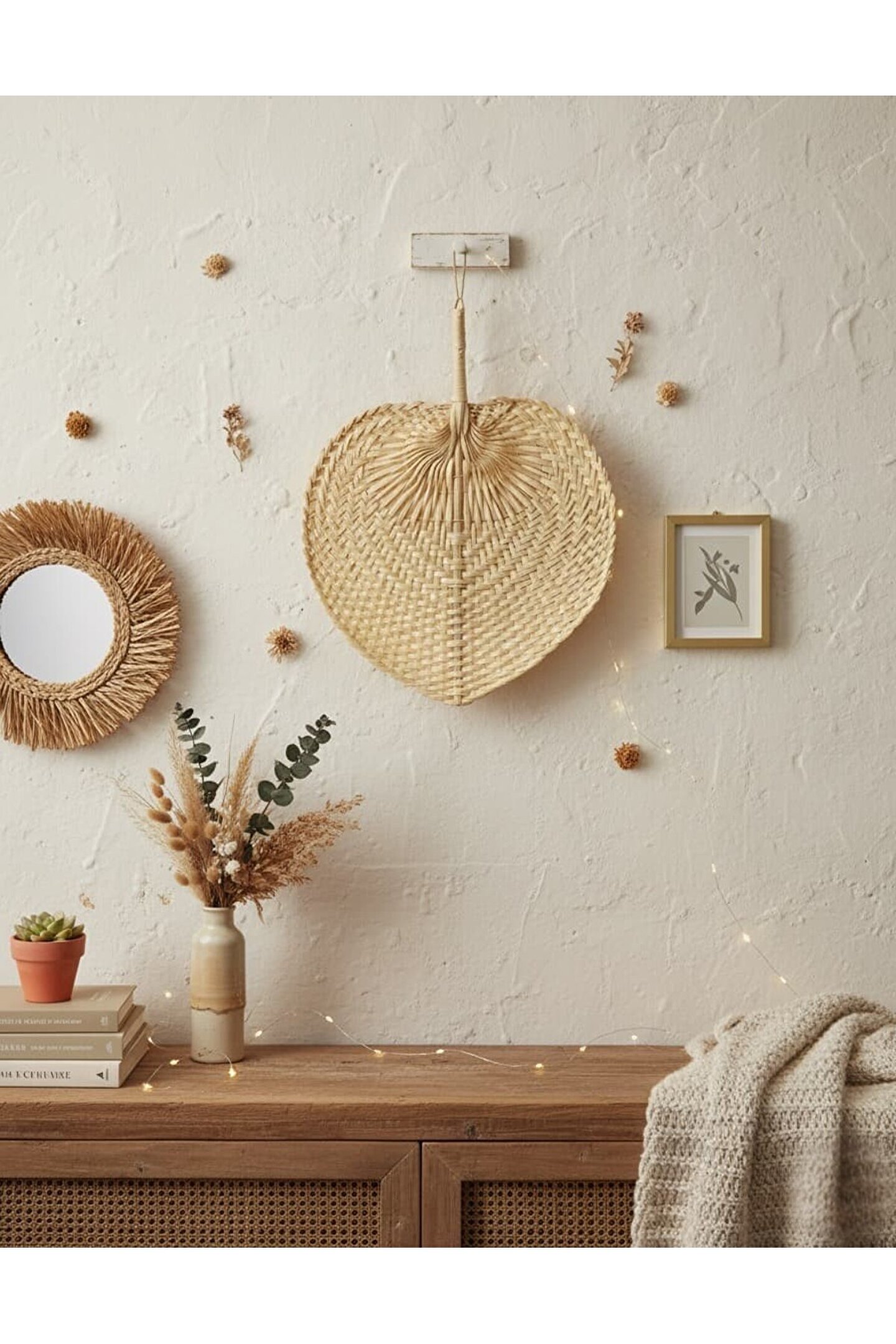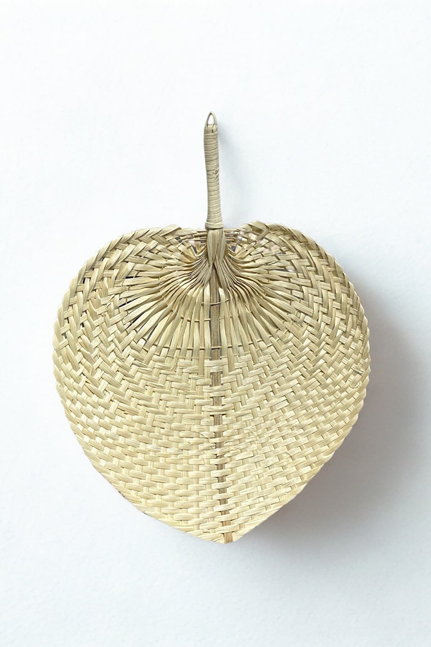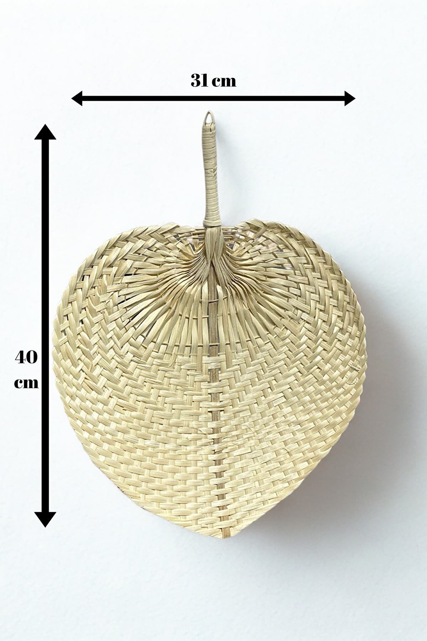Doğal bambudan özenle örülmüş kalp formunda el yelpaze; hem serinletir hem mekâna sıcak, organik bir dokunuş katar.