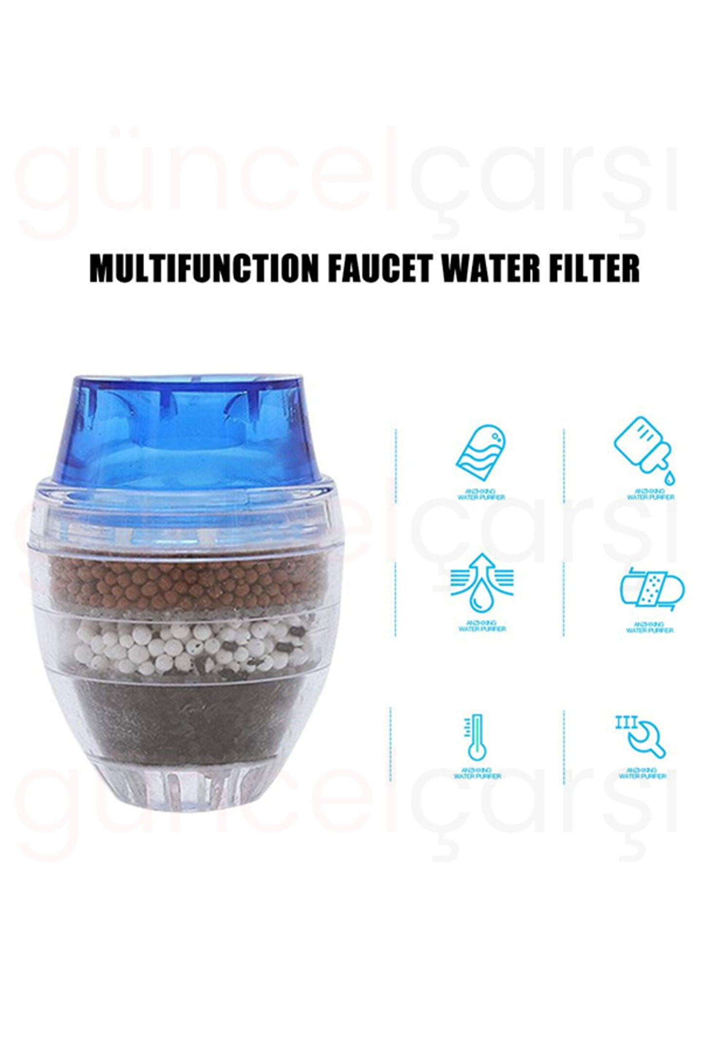 » 5 Katmanlı Aktif Karbon Su Arıtma Aparatı, aktif karbon filtrasyonu ve 5 katmanlı su temizleme filtresi ile evinizde sağlıklı suyun keyfini çıkarmanızı sağlar. ; » Suyunuzu filtreleyin ve arındırın, ailenize en iyi ve sağlıklı suyu verin. Sunup 5 Katmanlı Aktif Karbon Su Arıtma Aparatı ile anında harika arıtılmış su üretebilir ve en iyi tadım kahve ve çay yapmanıza yardımcı olabilir. ; » Malzeme: Aktif karbon, kalsiyum sülfit, zeolit, PVA nonwovens » Boyut: Musluğun çapı 21-23mm veya 16-19mm için uygundur » Renk: Mavi, kırmızı, yeşil » Uygulama: Musluğu temizleyin ve esnek poşetlere doğrudan zorla » Su Kalitesi Gereksinimleri: Belediye suyu ; » Su Arıtma Makinesi Tipi: Ön filtre » Tip: Aktif karbon » Fonksiyon: Filtre ; » İpucu: Lütfen uzun süre sıcak su altında kullanmaktan kaçının. 50 °C'nin altında tavsiye edilir. İlk kullanımda siyah suyu göreceksiniz çünkü karbon, 5-10 saniye sonra iyi çalışabilir. Yaşam Süresi: Su kalitesine göre, her gün kullanım için normalde 1-2 ay. ;
