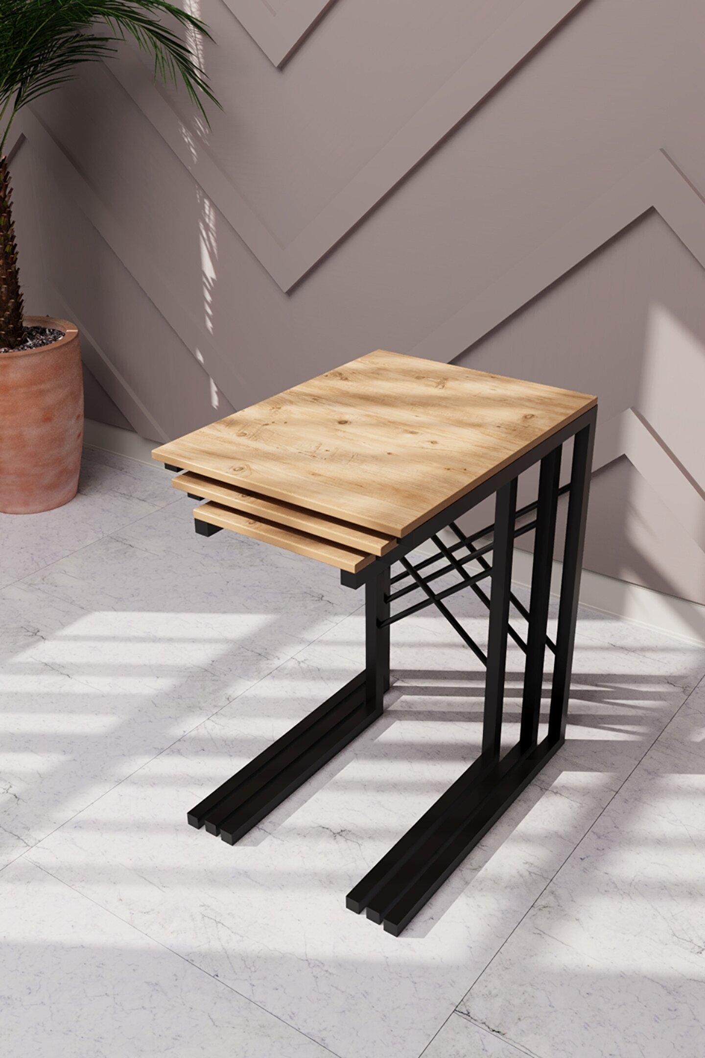 3'lü zigon sehpa seti, dekoratif açıdan da büyük bir avantaj sunar. Çam renginin sıcaklığı ve metalin modernliği ile tasarlanmış bu sehpalar, her türlü iç mekan dekorasyonuna uyum sağlar ve estetik bir bütünlük oluşturur. Dekorasyon tarzınız ne olursa olsun, bu zigon sehpa seti evinize şıklık katacak ve misafirlerinizi etkileyecektir.
