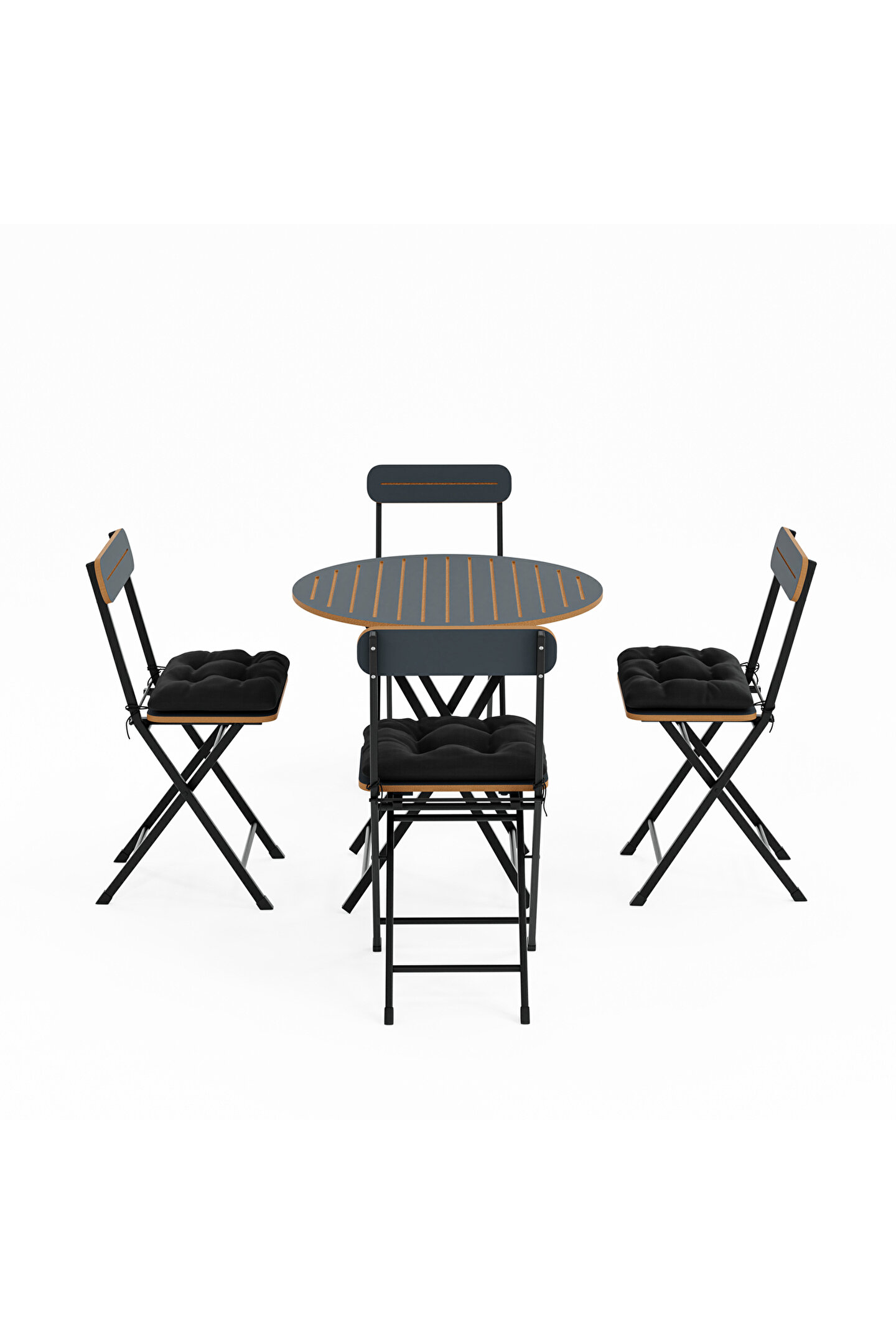 • Dört sandalye ve bir yuvarlak masa içeren tam bir oturma grubu.