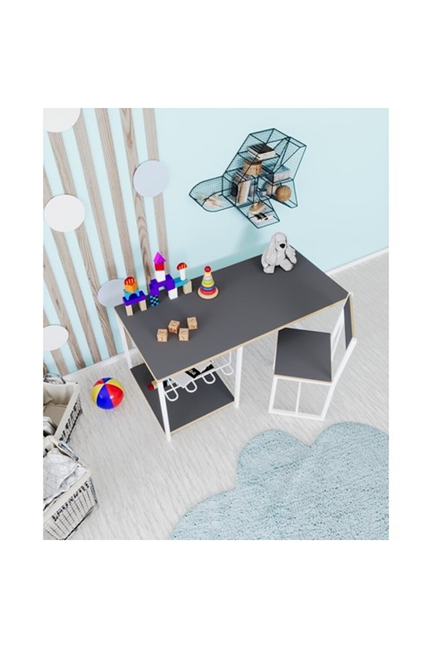 ve sandalyesi metal profil ayaklar, masanın kararlılığını artırırken, modern ve minimalist tasarımı, çocuk odalarına çağdaş bir hava katıyor.