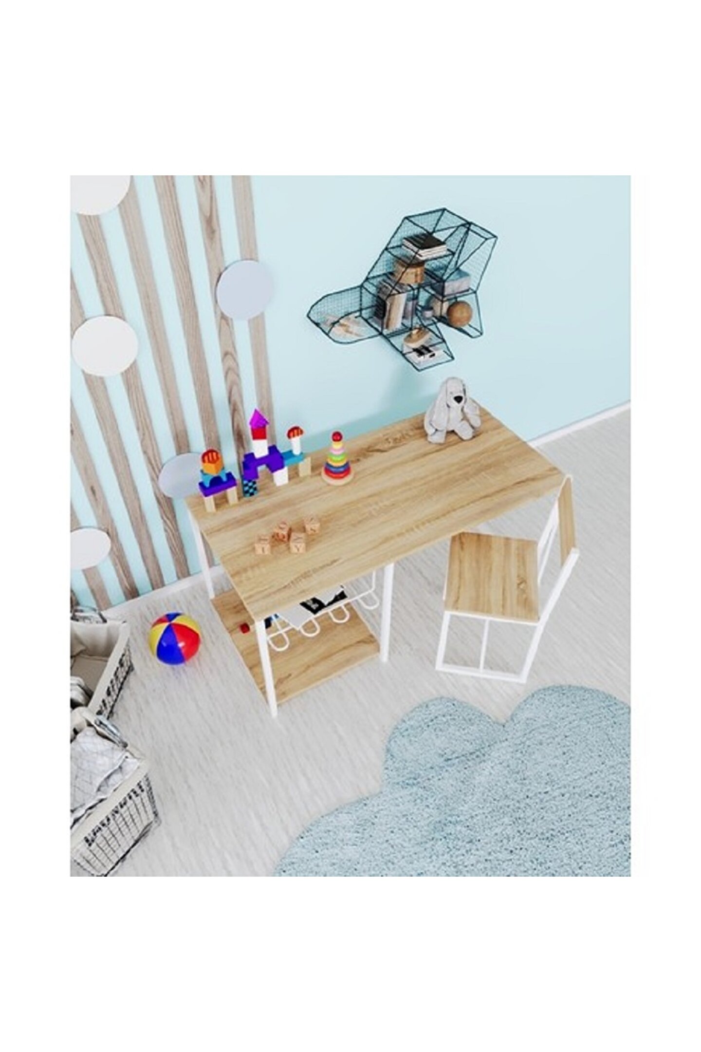 ve sandalyesi metal profil ayaklar, masanın kararlılığını artırırken, modern ve minimalist tasarımı, çocuk odalarına çağdaş bir hava katıyor.