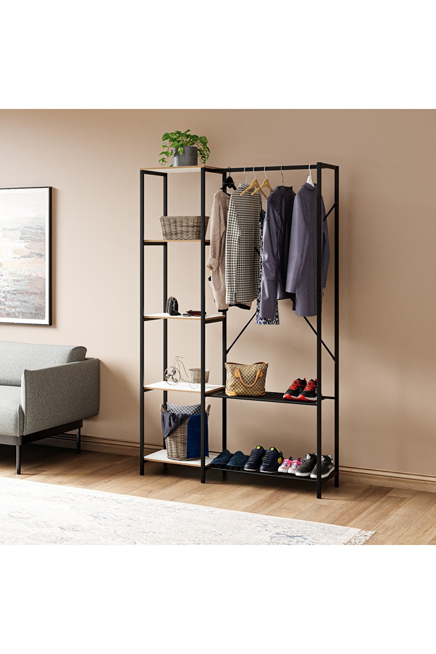 Çok Amaçlı Metal Ayaklı Raflı Dolap Ayakkabılık Portatif Portmanto Gardırop'in kurulumu tamamlandıktan sonra, sadece fonksiyonel bir depolama alanı olarak değil, aynı zamanda odanızın dekoratif bir öğesi olarak da ön plana çıkacağını göreceksiniz. renginin sıcak tonları, mekana doğal bir dokunuş katarak evinizin atmosferini zenginleştirir. Metal ayaklar ise, modern bir estetikle sağlamlığı birleştirerek, her türlü kullanım koşuluna dayanıklı bir yapı sunar.