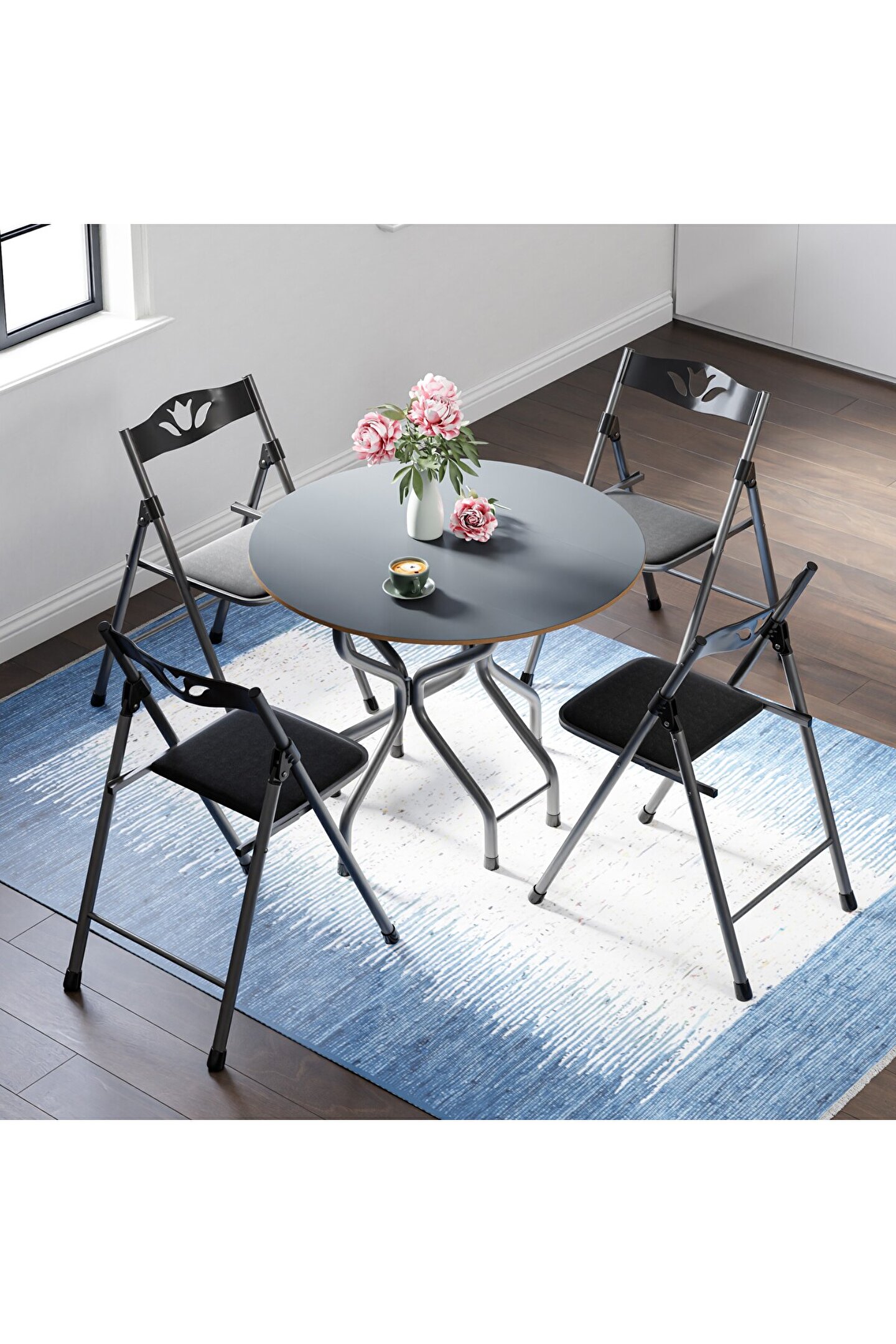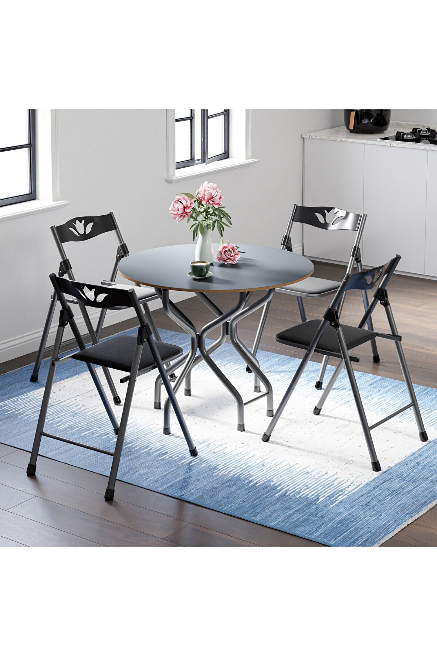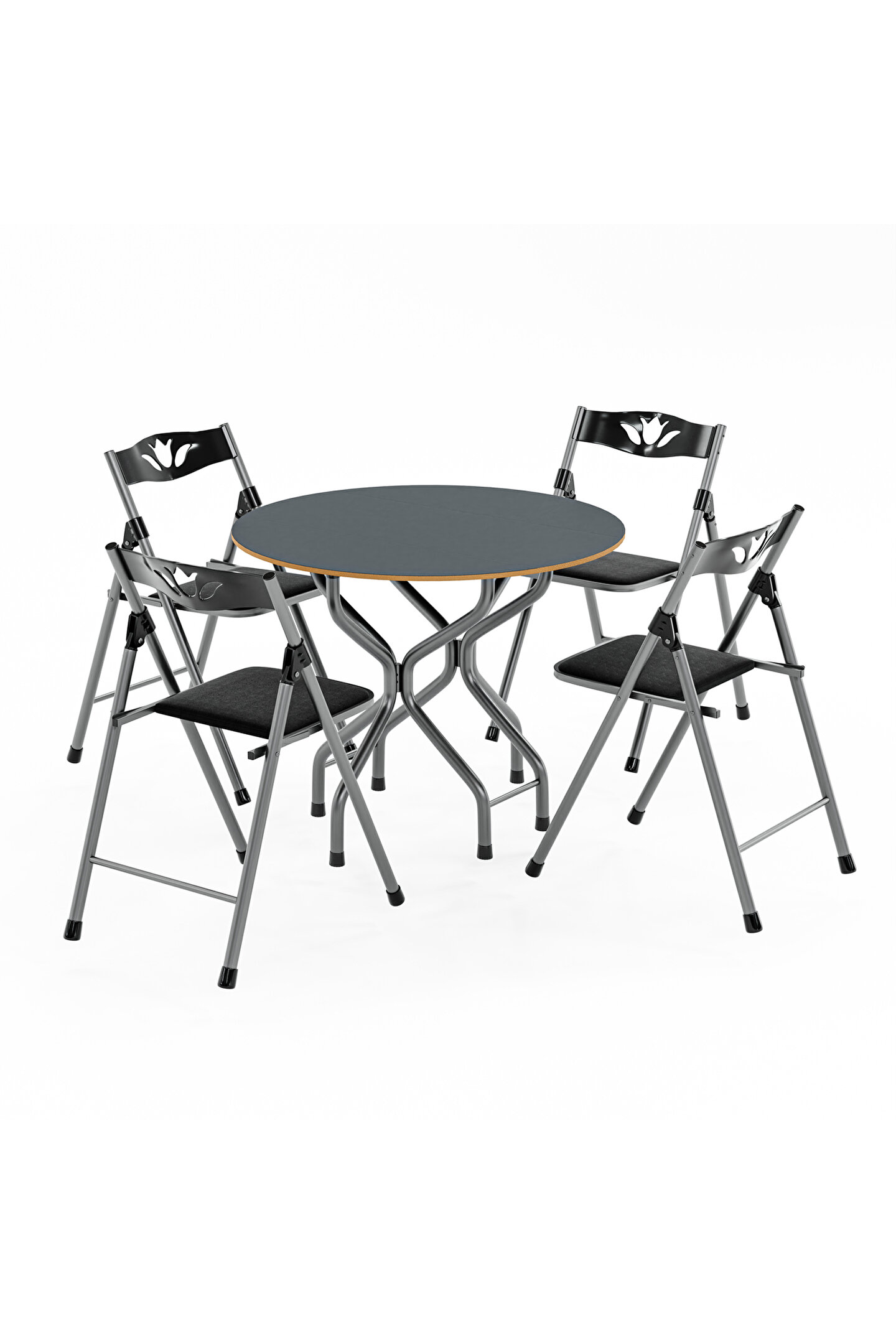 Evlerin herhangi bir alanında ve aynı zamanda iş yerlerinde de kullanılabilen Mutfak Masa Sandalye Takımı Bahçe Yemek Masa Seti Yuvarlak, dört adet sandalye ve bir adet yuvarlak masadan meydana gelen bir settir. Siyah renk tonlarında üretilen