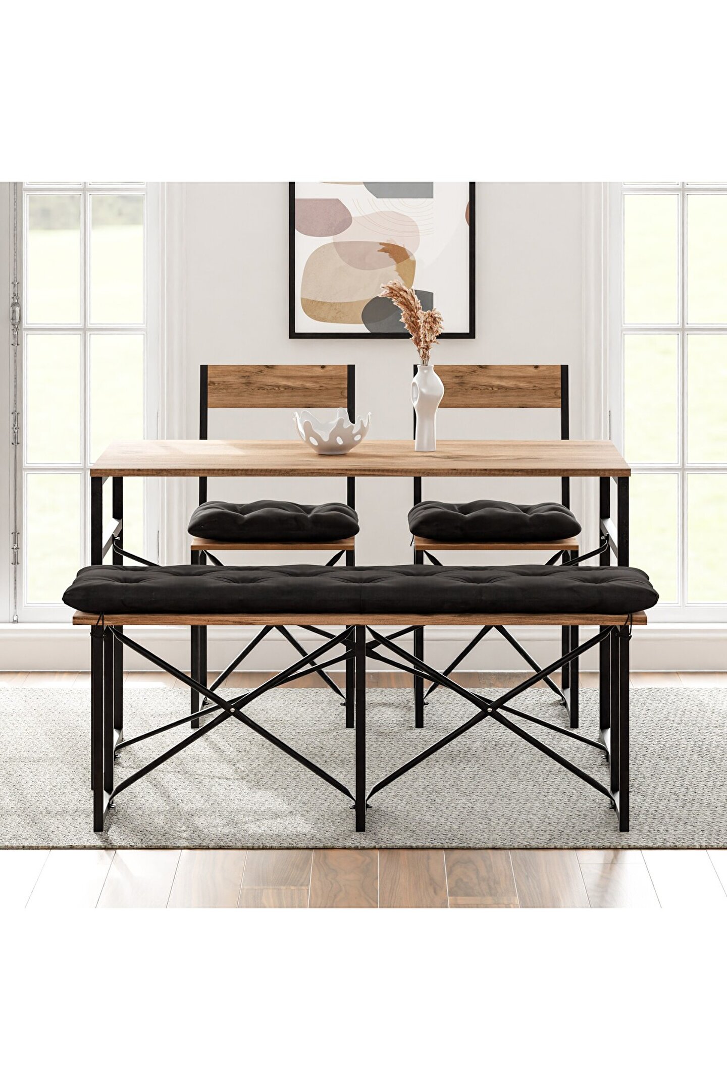 Mutfak Masası Bench Bank, hem estetik hem de kullanım açısından zengin özelliklere sahip bir mobilya setidir. Bu setin modern ve sade görünümü, herhangi bir yaşam alanına çağdaş bir hava katarken, sağlam yapısı ve kaliteli malzemeleri uzun ömürlü bir kullanım sunar. Ahşap ve metalin uyum içinde buluştuğu tasarımı, günümüzün minimalist dekorasyon anlayışına mükemmel bir şekilde uyum sağlar.
