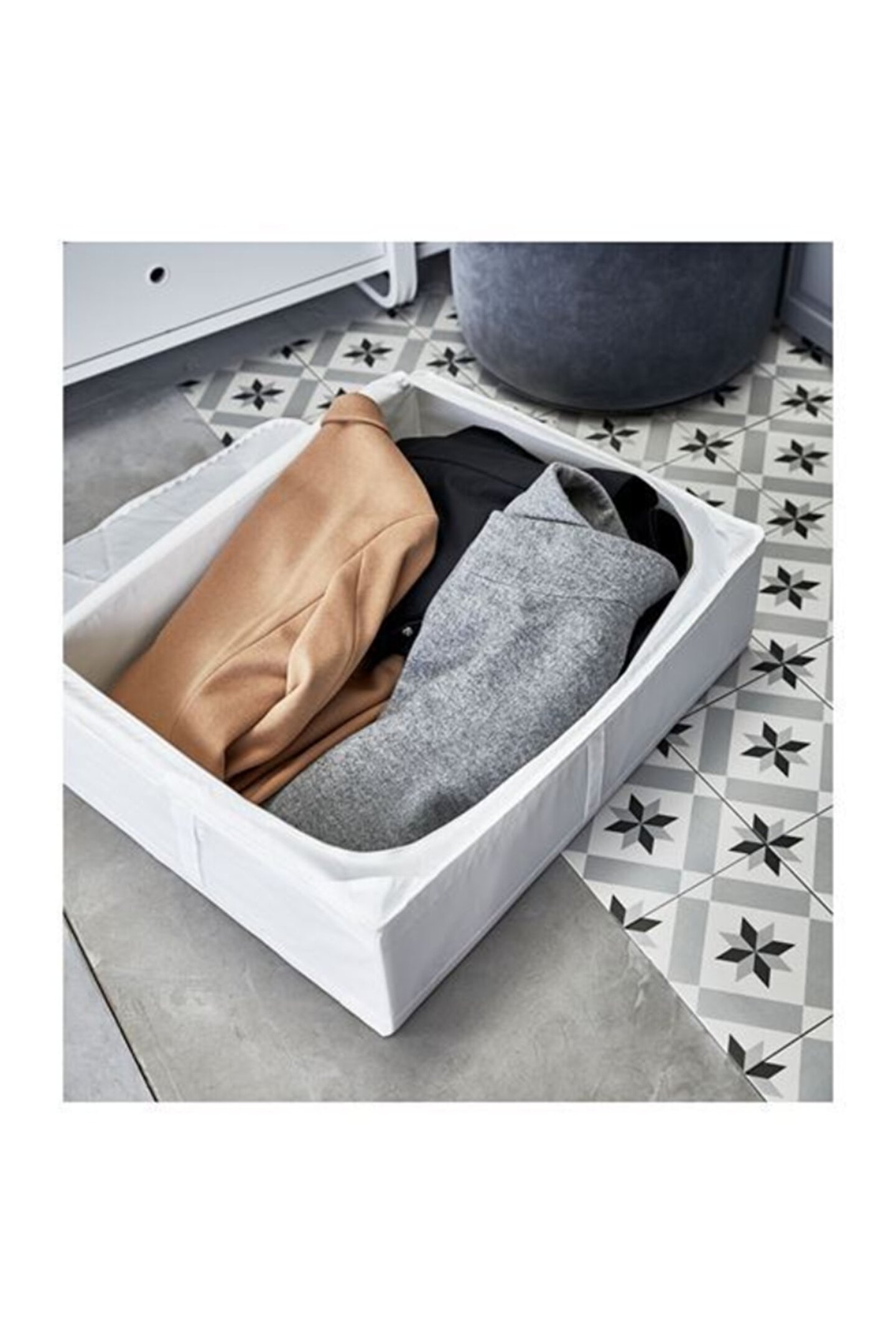 IKEA marka saklama kutusu, yatak altı yastık, çarşaf, nevresim, giysi ve bohça gibi eşyalarınızı düzenli bir şekilde saklamanız için ideal bir çözüm sunar; 69x55x19 cm boyutlarındaki bu kutu, geniş iç hacmiyle birden fazla eşyanızı rahatça sığdırmanıza olanak tanır; Fermuarlı tasarımı sayesinde eşyalarınızı güvenle saklamanızı sağlar ve kolay erişim imkanı sunar; Yıkama talimatlarına uygun şekilde temizlenmesi, ürünün hijyenik kalmasını ve ilk günkü gibi kalmasını sağlar;