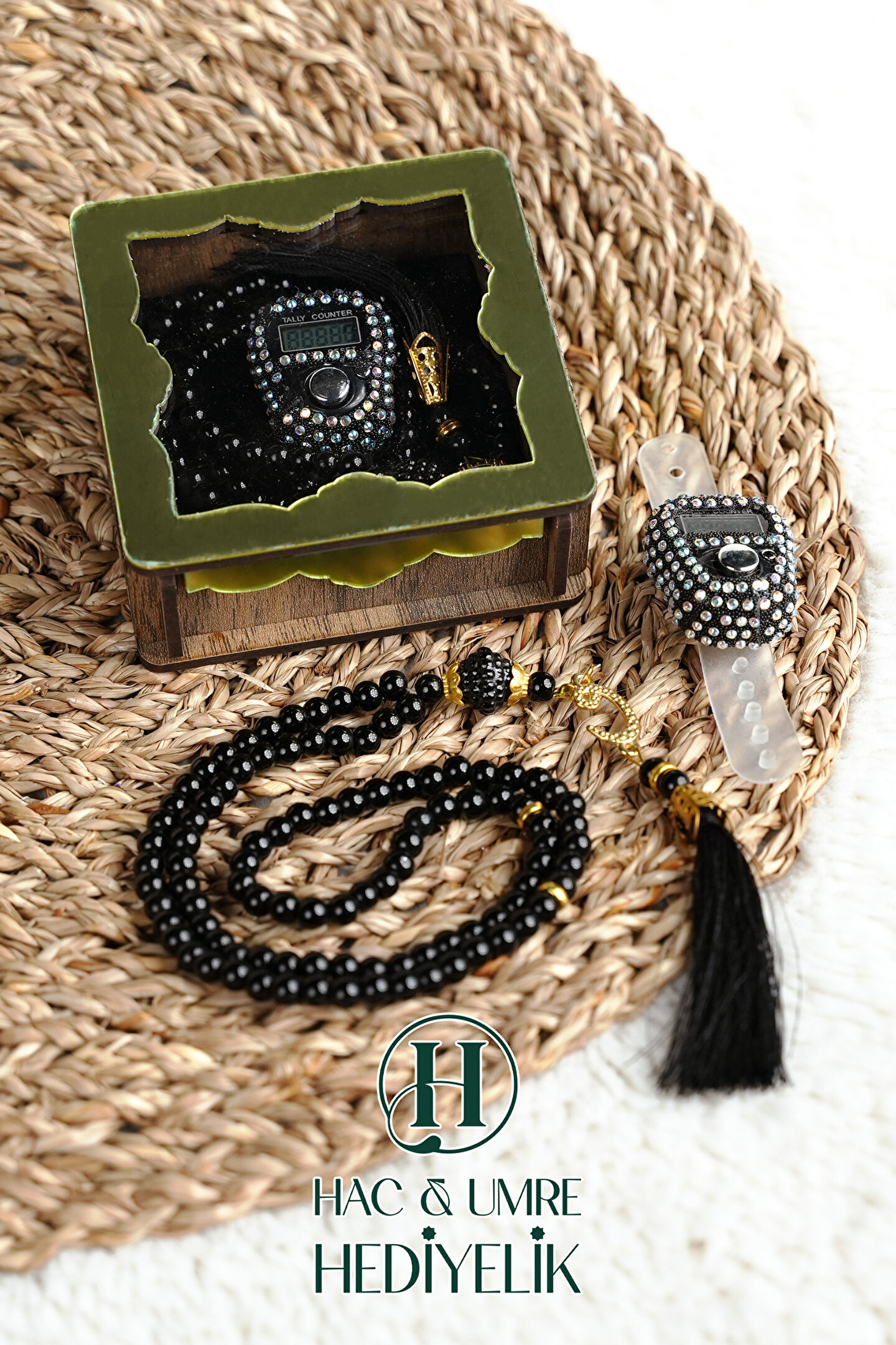 ✨ Lüks Taşlı Zikirmatik ve 99'lu Ahşap Kutulu Tesbih Seti ✨