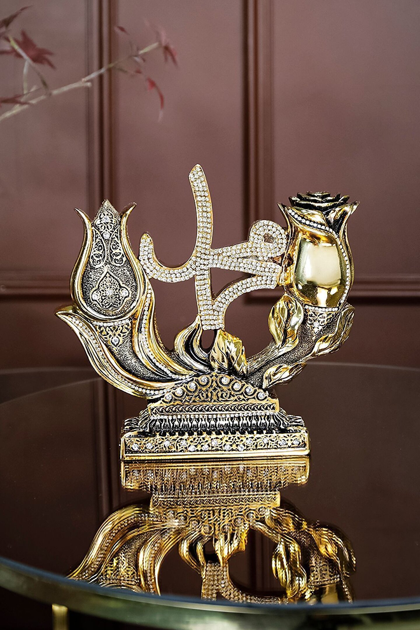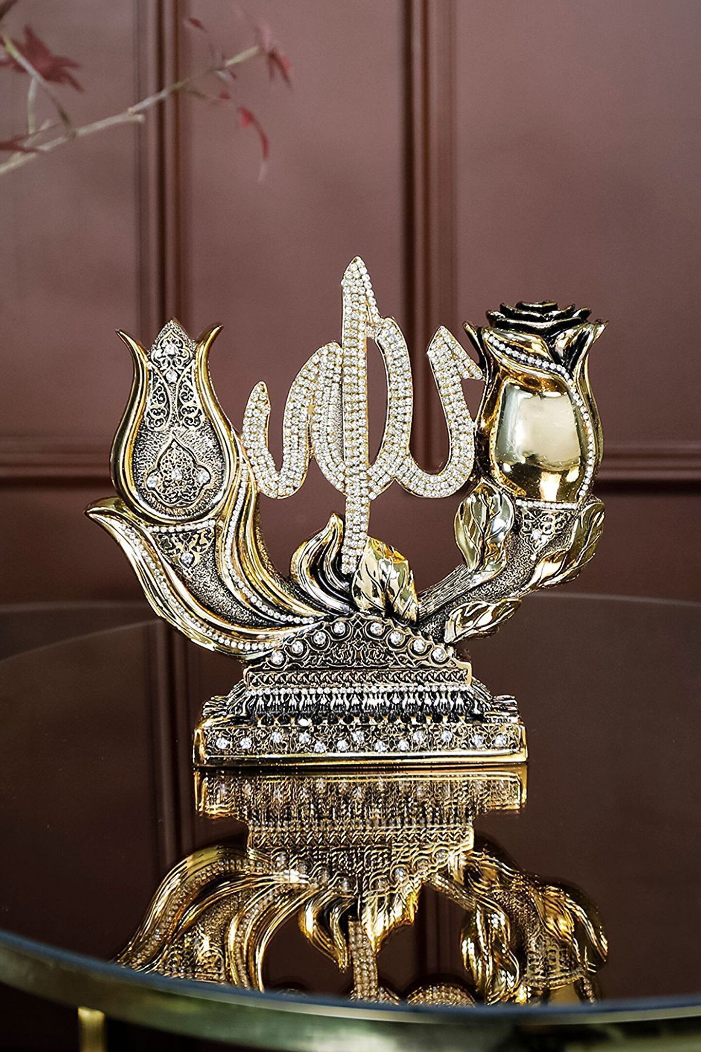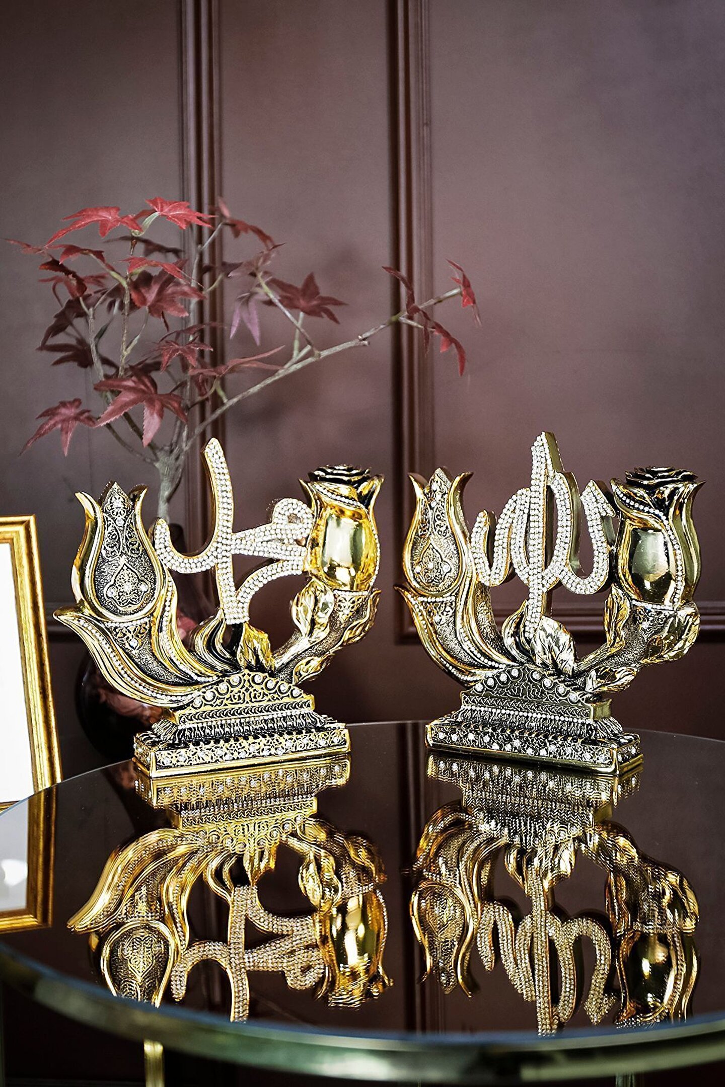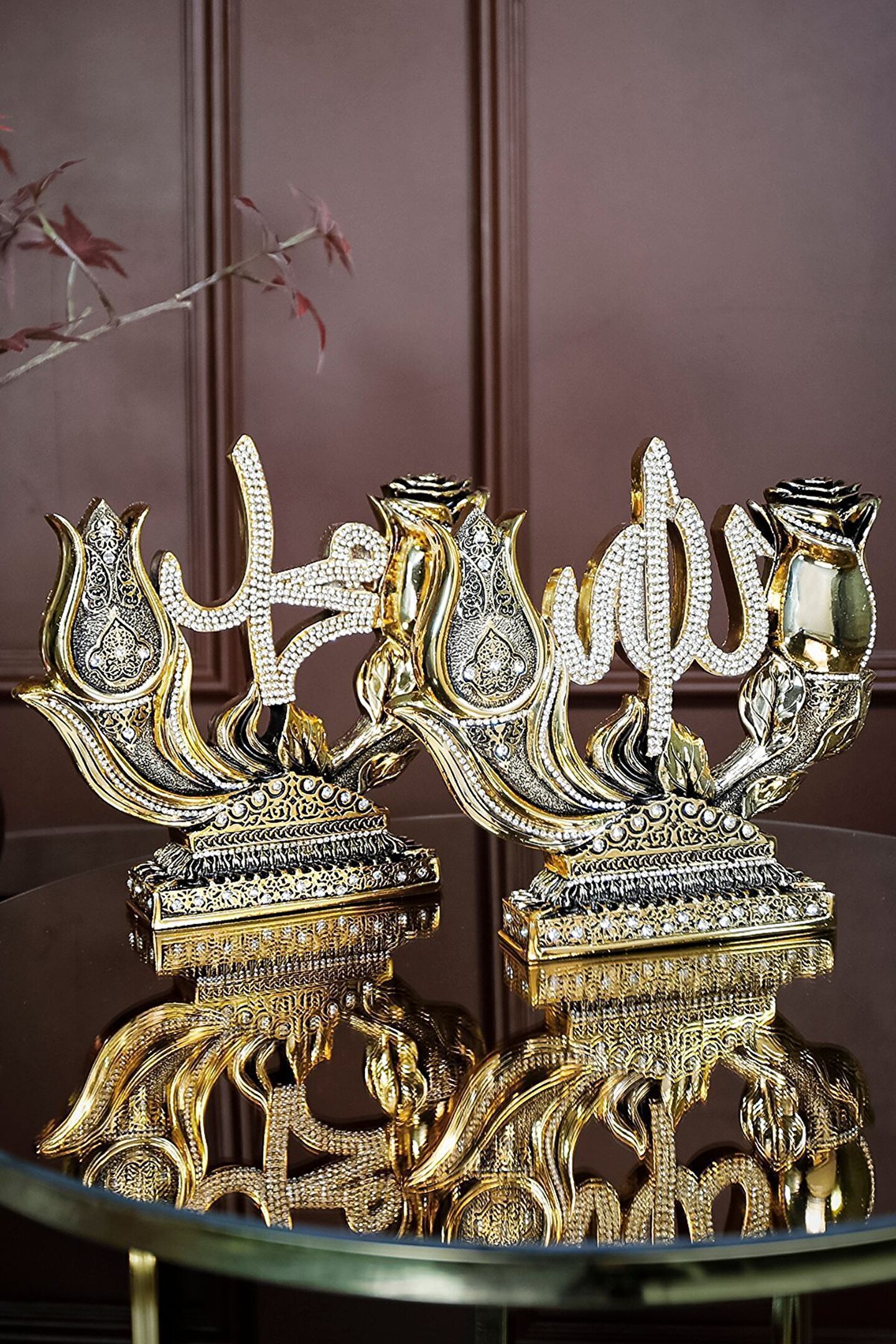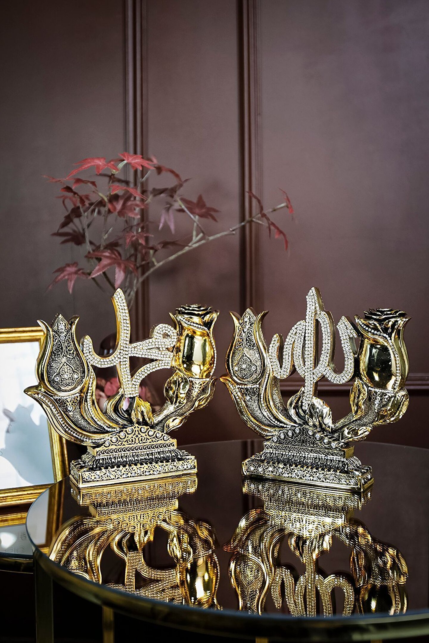 İki Lafız Çok Mana|Lale ve Gül Motifli Dekoratif Biblo ? Geleneksel Türk İslam Edebiyatı ve sanatlarının derin simgelerini taşıyan bu dekoratif biblo, lale ve gül motifleri aracılığıyla özel bir anlam yaratıyor. Lale, Allah'ı temsil ederken, gül ise peygamberimizi sembolize ediyor. İki parçadan oluşan bu zarif sanat eseri, geleneksel sembolizmimizi ve estetiği bir araya getiriyor. Lale ve Gül motiflerinin merkezinde yazılı Allah (c.c) ve Muhammed (s.a.s) lafızları, bu bibloyu sadece bir dekoratif obje olmaktan çıkarıp, aynı zamanda derin sevgi ve hasreti betimliyor. El işçiliğiyle özenle hazırlanan bu eser; evinizi, ofisinizi ya da sevdiklerinizin yaşam alanlarını güzellikle donatmanın ötesinde, mekan atmosferine derin bir anlam katıyor. Bu zarif eser sizin ve sevdiklerinizin yaşam alanlarına renk katmak için sizleri bekliyor... ? Hemen sipariş için ürün kodu: CN 106 ? Ürün Özellikleri: Orijinal Tasarım El Yapımı ve Yüksek Kaliteli Metalize Sert Polyester Malzeme Altın Kaplama 21x19,5 cm 860+765 gr El İşçiliği ? Kullanım Alanları: Yaşam alanlarına zarafet katmak için, Manevi bir hediye olarak, Dekoratif süs olarak, Anneye, Babaya, Eşe Hediye olarak, Yıldönümü, Doğum Günü, Terfi, Ev ve Ofis Hediyesi Olarak, Bereketin simgesi olması için, Maneviyatı hatırlatması için, Başarı ve sanatsal üretime ilham olması için, Kurumsal hediye ve diğer alanlarda kullanılabilir.