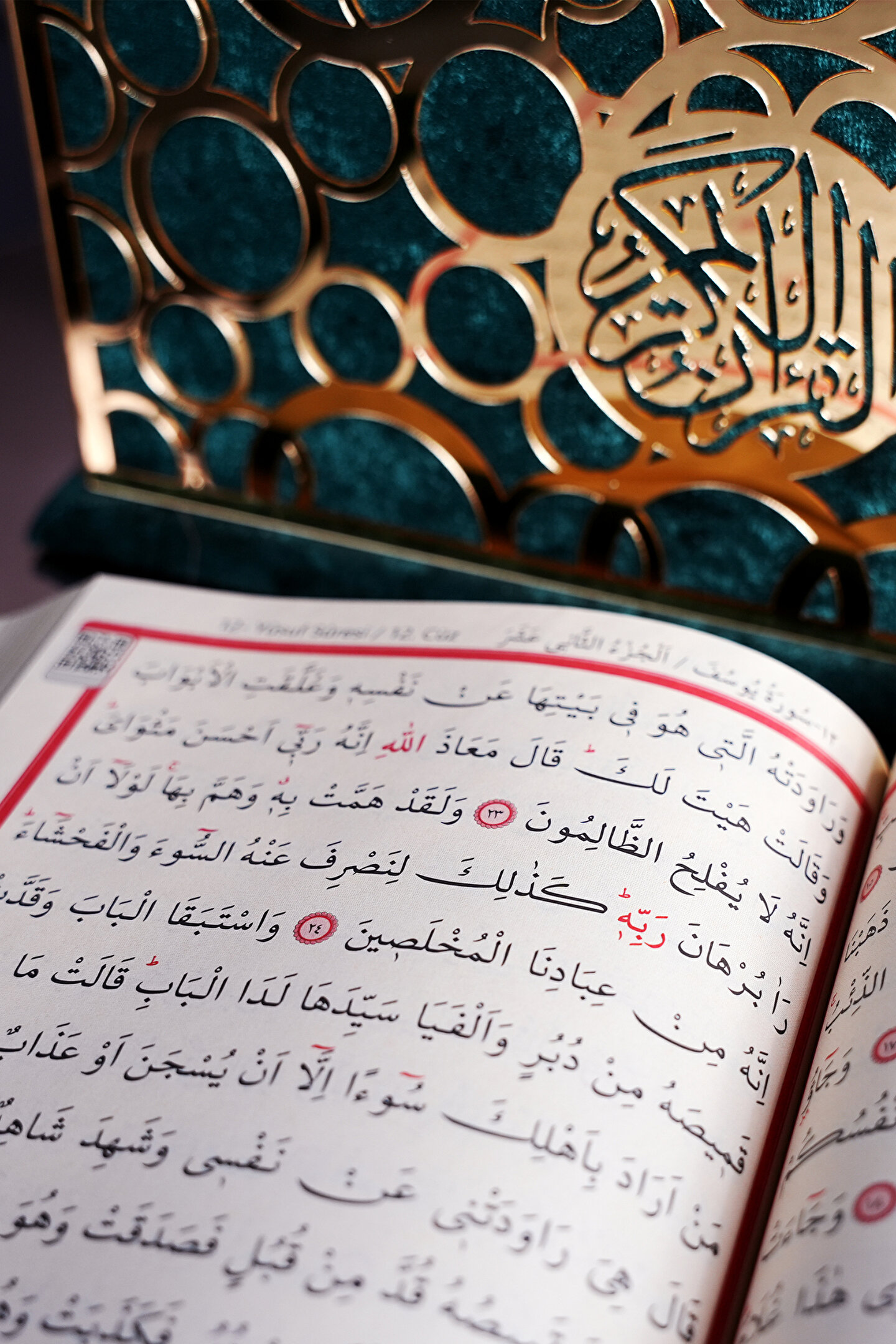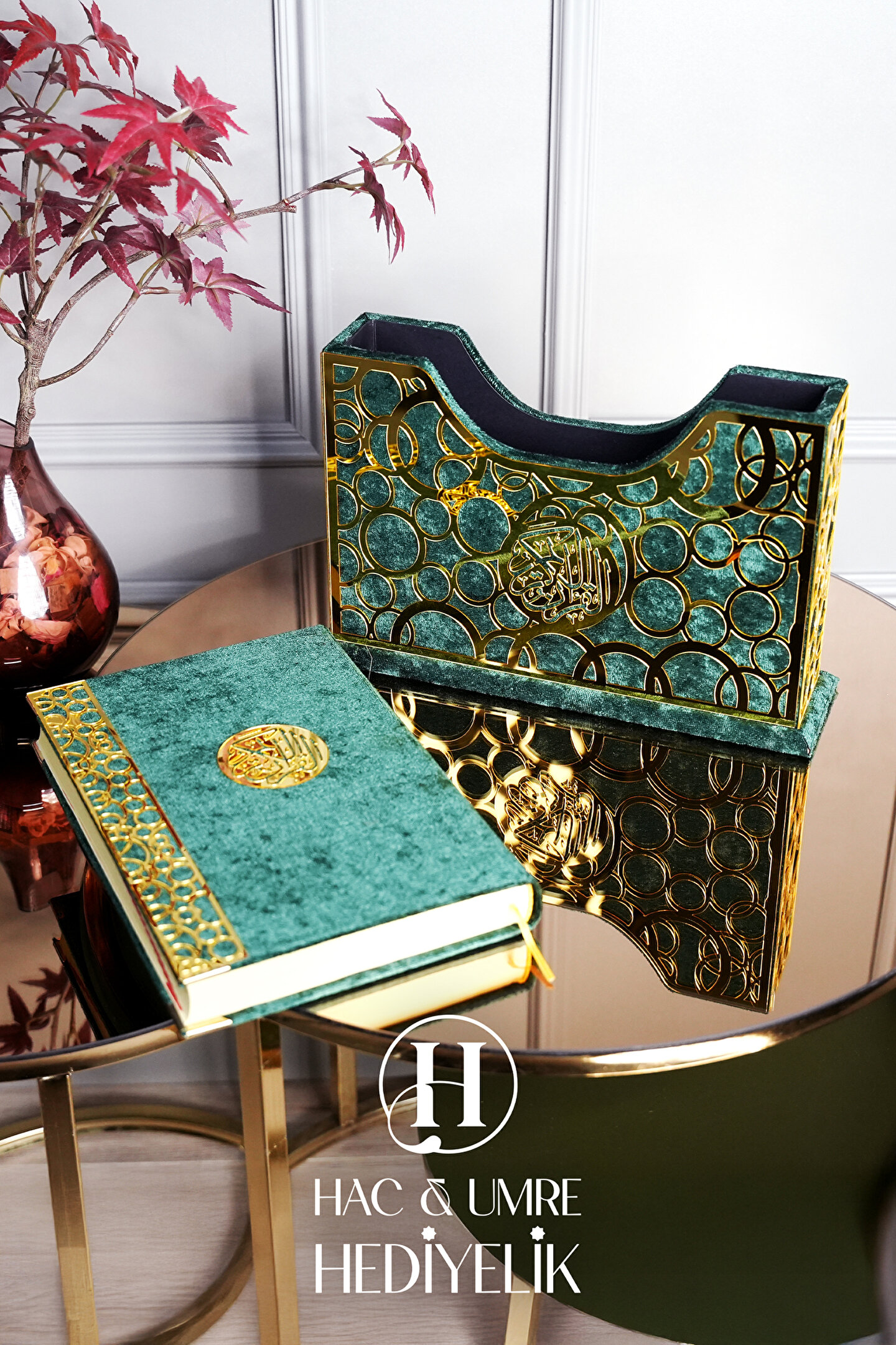 Şıklığı ve maneviyatı bir araya getiren bu lüks set, altın işlemeli kadife kaplı ahşap plaket kutu