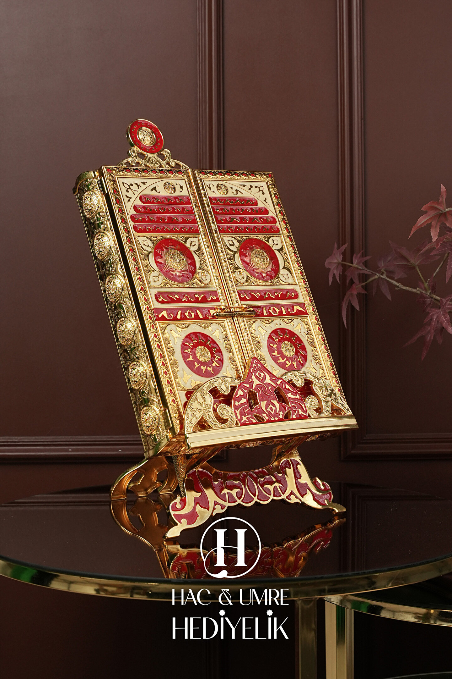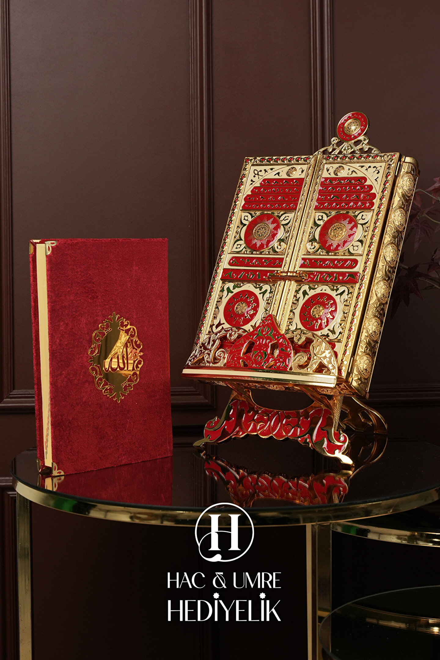 ✨ Kadife Kur’an-ı Kerim Seti | Altın Kırmızı Kutulu ve Standlı