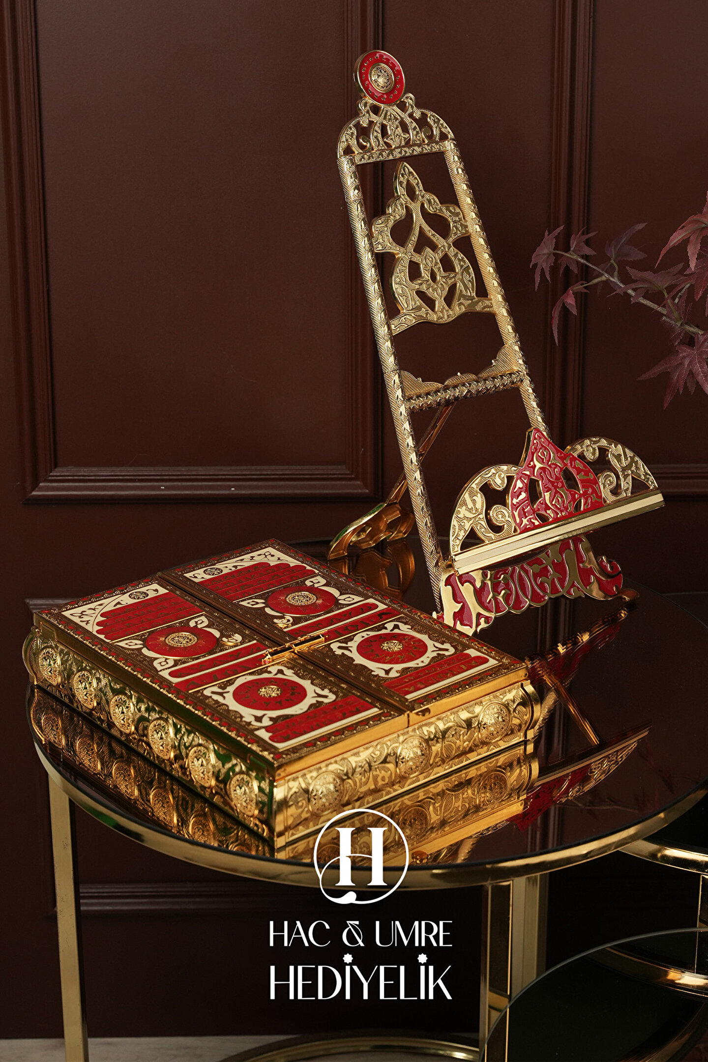 Hac Umre Hediyelik Kuran Kabı | Kuran Standı | Desenli Standlı Kuran Kabı ve Kadife Kuran Hediyeli | Kuranı Kerim Seti