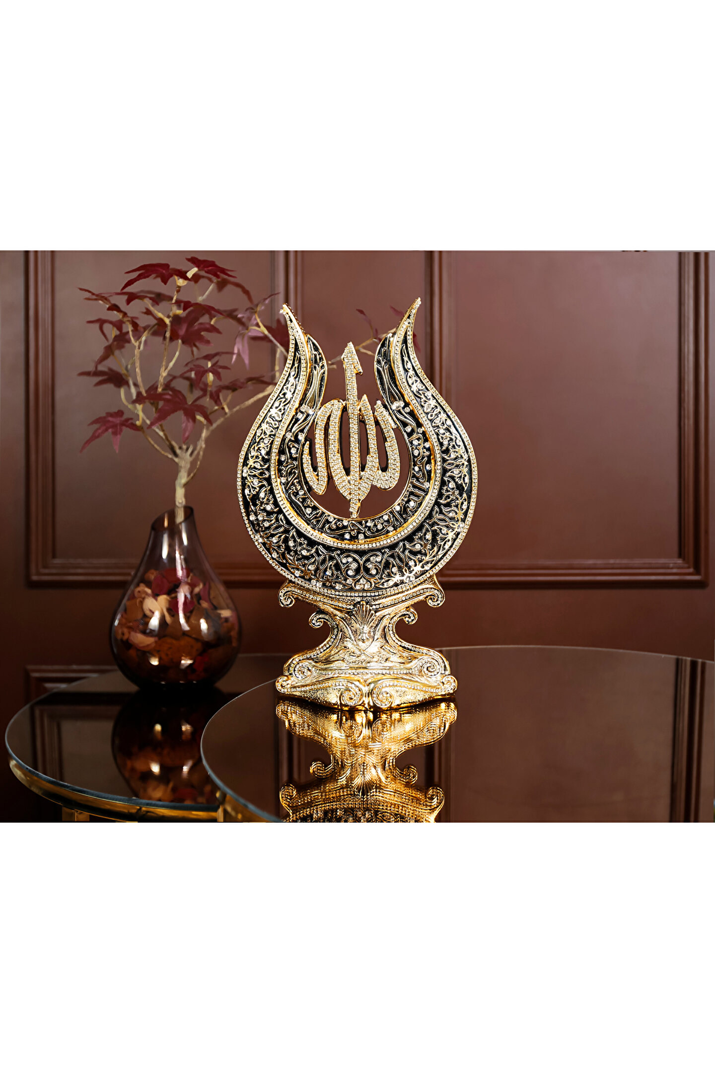 MASAÜSTÜ LALE LAFIZLAR DEKORATİF BİBLO ? Bu özel dekoratif biblo, zarif lale motifleri içinde barındırdığı Allah (C; C; ) ve Muhammed (S; A; V; ) lafızlarıyla, masaüstünüzü hem estetik hem de manevi bir atmosferle dolduruyor; Her bir detayı özenle işlenmiş olan bu eser, güzelliği ve kutsallığı bir araya getirerek evinize benzersiz bir dokunuş katıyor; ? Hemen sipariş için ürün kodu: CN 200 ? Ürün Özellikleri: Orijinal Tasarım El Yapımı ve Yüksek Kaliteli Metalize Sert Polyester Malzeme Altın Kaplama 18,5x31 cm 1060+880 gr; El İşçiliği ? Kullanım Alanları: Yaşam alanlarına zarafet katmak için, Manevi bir hediye olarak, Dekoratif süs olarak, Anneye, Babaya, Eşe Hediye olarak, Yıldönümü, Doğum Günü, Terfi, Ev ve Ofis Hediyesi Olarak, Bereketin simgesi olması için, Maneviyatı hatırlatması için, Başarı ve sanatsal üretime ilham olması için, Kurumsal hediye ve diğer alanlarda kullanılabilir;