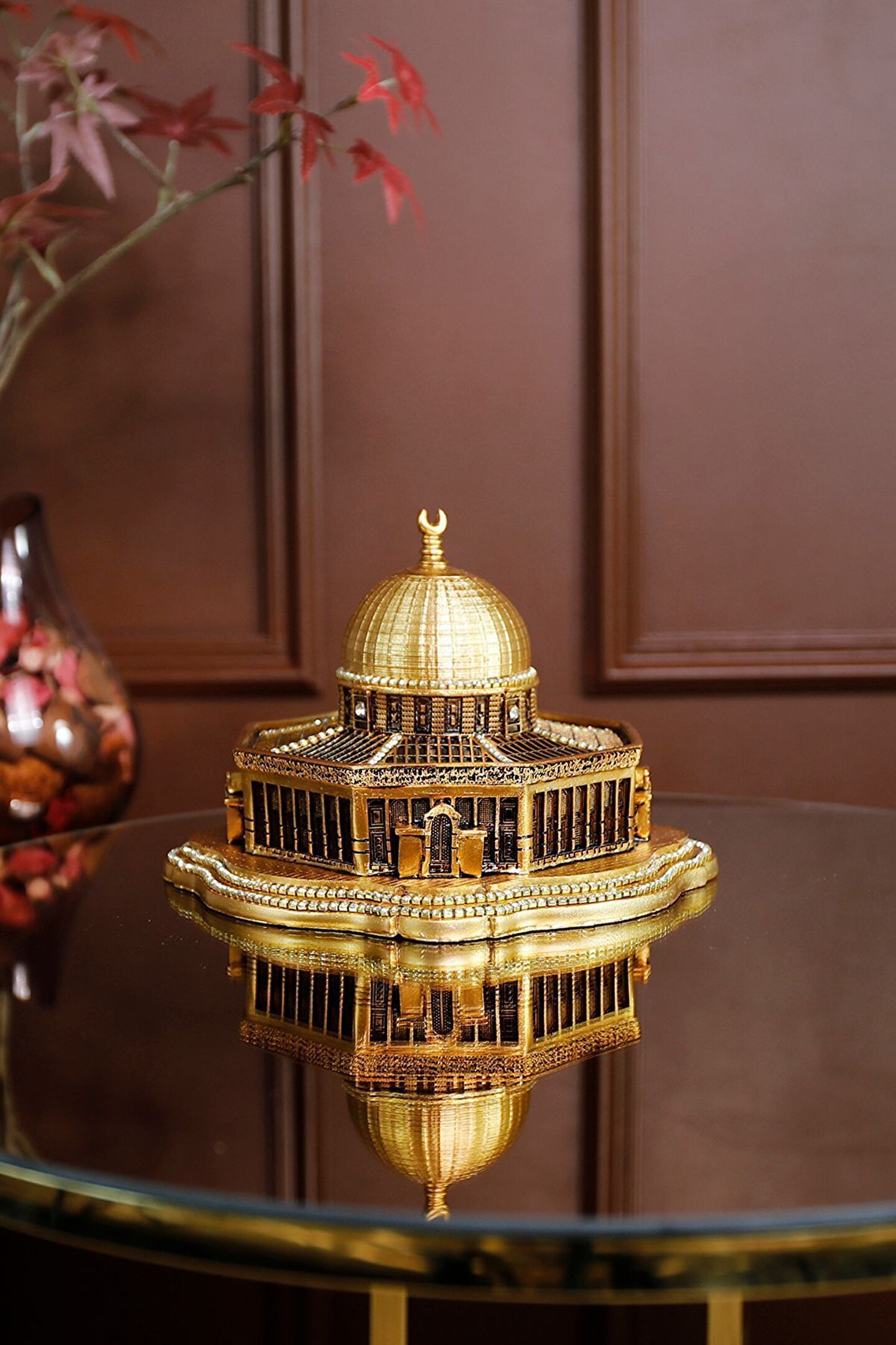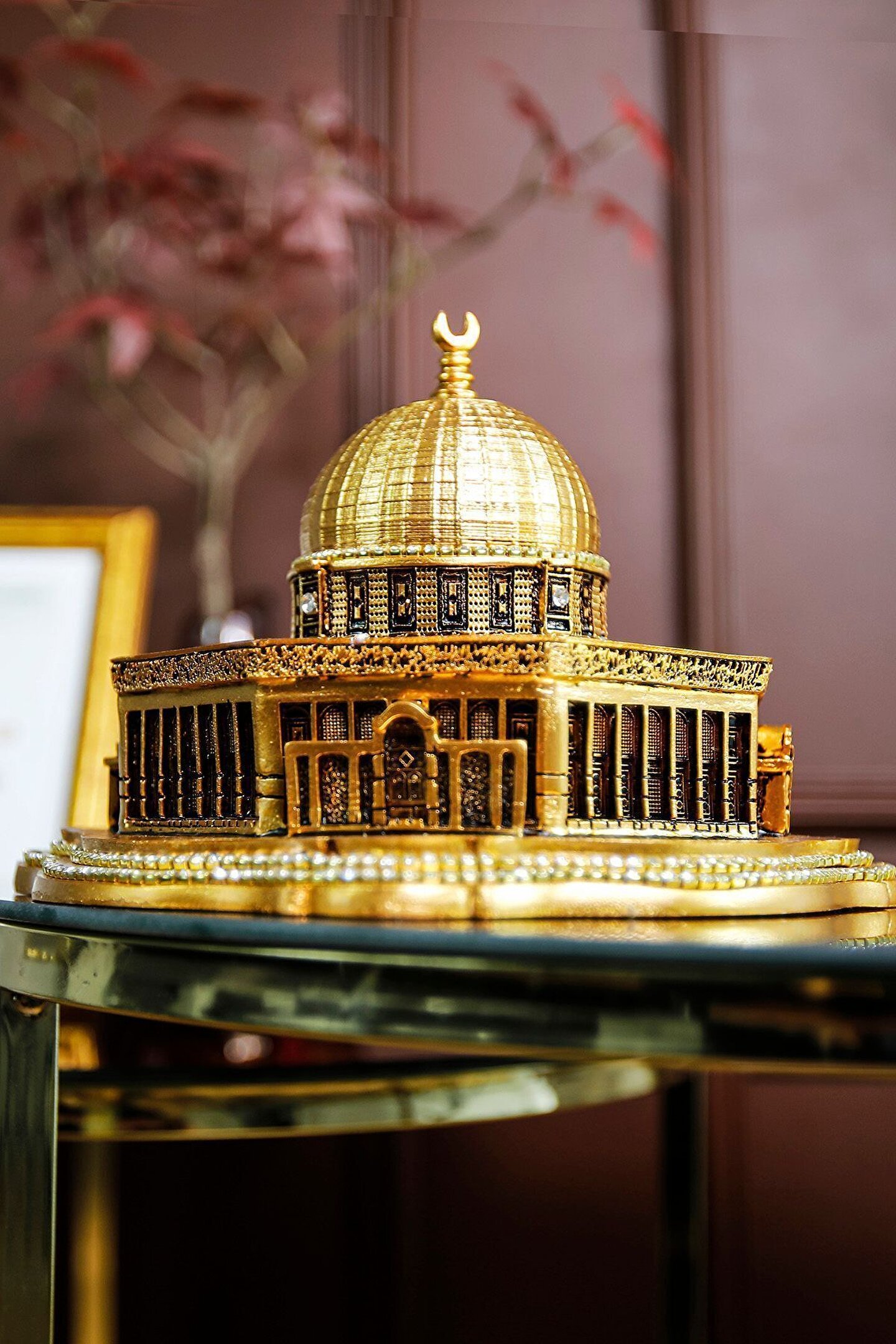 Mescidi Aksa Direnişinin sembolü ve İlk Kıblenin Kadim Komşusu : Kubbetüs Sahre Biblo ? Bu özel biblo, zarif tasarımıyla Kubbetüs Sahre'nin etkileyici siluetini taşırken, estetikle tarihin büyüsünü birleştiriyor; Her detayı özenle işlenmiş olan bu eser, zulme direnişi ve vazifeleri hatırlatıyor; ?? Kubbetü's; Sahre İslâm mimârîsinde bilinen ilk kubbeli eserlerdendir; Bu yapı Abdülmelik'in halifelik döneminde 689; 691 yılları arasında inşa edilmiştir; Binanın mimarları Kudüs'lü Yezid Bin Salam ve Baysan'lı Raja Bin Hayve'dir; Orijinal kubbe 1015'te yıkılmış ve 1022; 23'te yeniden inşa edilmiştir; Kubbetü's; Sahre, kubbe iç süslemelerinde İslam inancını yansıtan ilk tarihi eser ve İslam mimarisinin günümüze ulaşmış en eski eserlerinden biri kabul edilir; Dış görünümü Osmanlı döneminde ve yine modern dönemde, özellikle 1959; 61'de altın kaplama çatının eklenmesiyle önemli ölçüde değişmiştir; ? Sonsuzluğun sembolü Kubbetüs Sahre'nin bu biblo üzerindeki yansıması, yaşam alanlarınıza sadece estetik bir dokunuş katmakla kalmıyor, aynı zamanda zulme karşı tavrınızı ortaya koyarak asil duruşunuzu gösteriyor; Senin de selamın Aksa'ya ise favori biblo ürünün belli! ?? Ürün Özellikleri: Orijinal Tasarım El Yapımı ve Yüksek Kaliteli Metalize Sert Polyester Malzeme Altın Kaplama 20x15 cm 1090 gr; El İşçiliği ? Kullanım Alanları: Yaşam alanlarına zarafet katmak için, Manevi bir hediye olarak, Dekoratif süs olarak, Anneye, Babaya, Eşe Hediye olarak, Yıldönümü, Doğum Günü, Terfi, Ev ve Ofis Hediyesi Olarak, Bereketin simgesi olması için, Maneviyatı hatırlatması için, Başarı ve sanatsal üretime ilham olması için, Kurumsal hediye ve diğer alanlarda kullanılabilir;