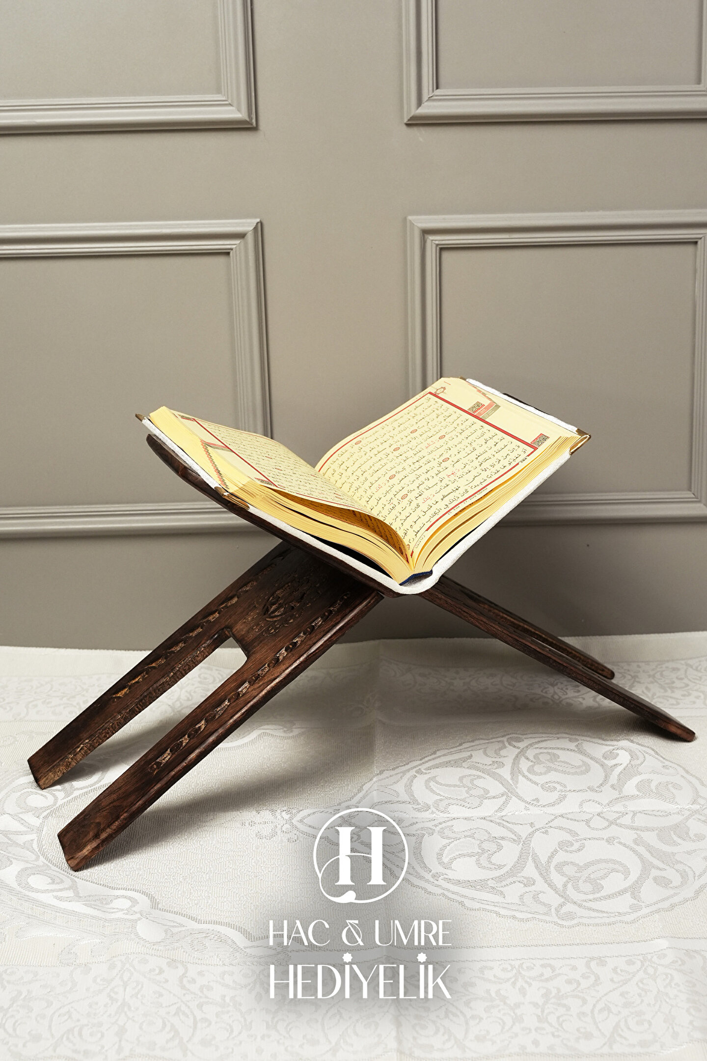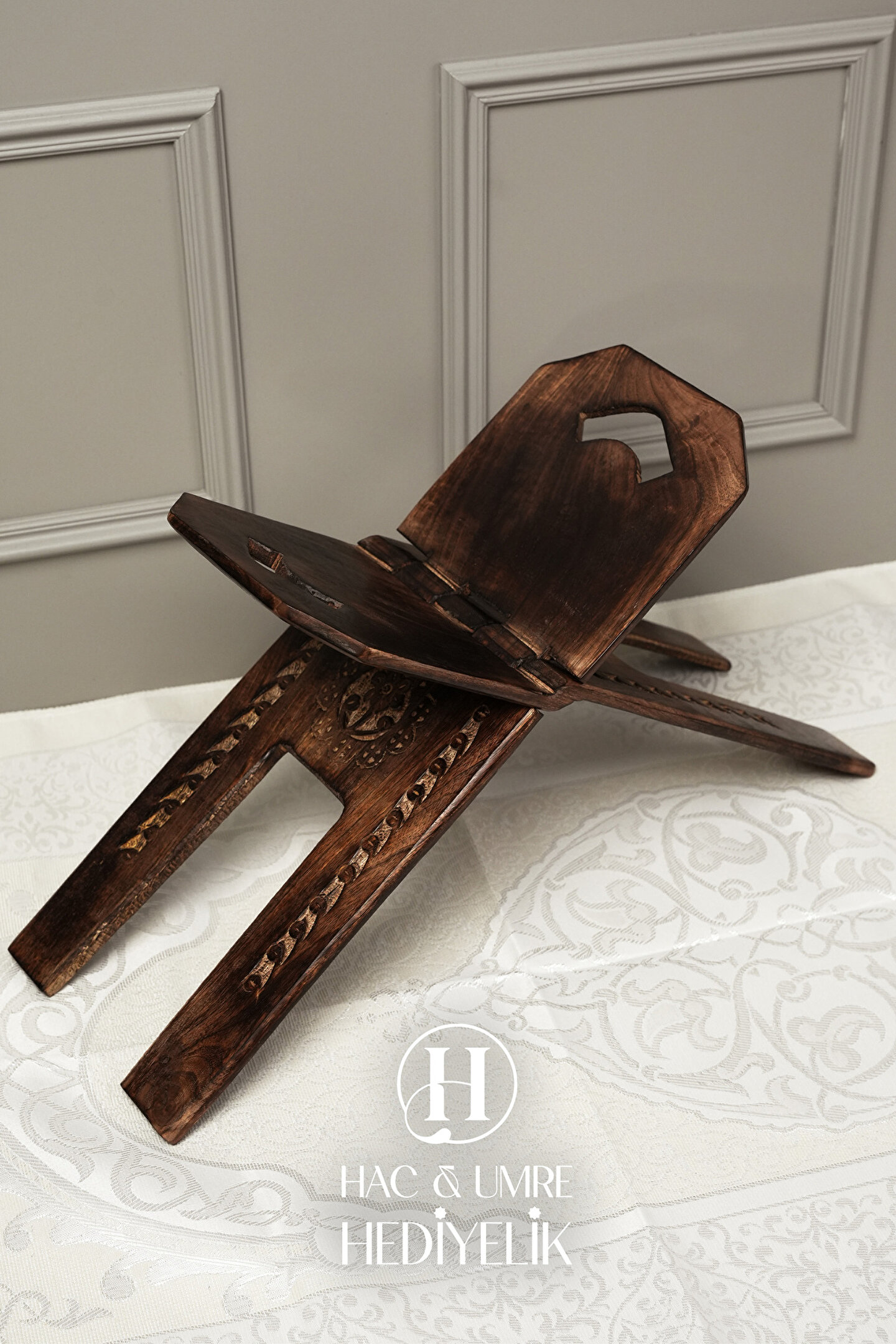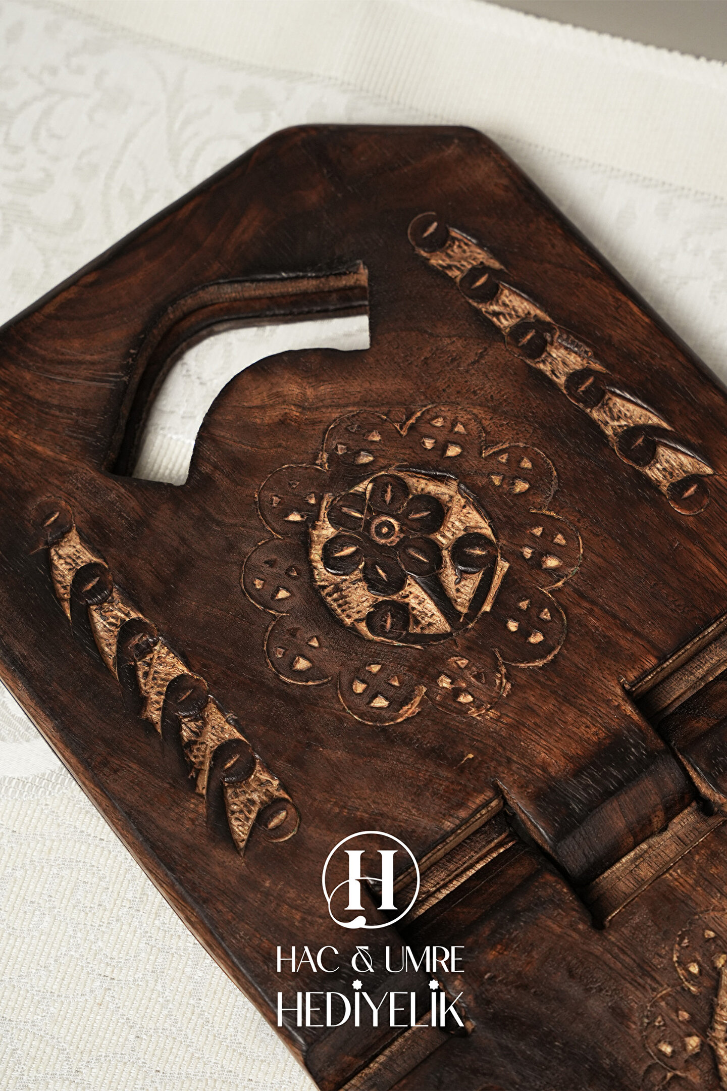 Hac Umre Hediyelik Rahle El Yapımı Masif Ahşap | Desenli Kulplu Kitap Okuma Standı | Küçük Boy Kuran Rahlesi