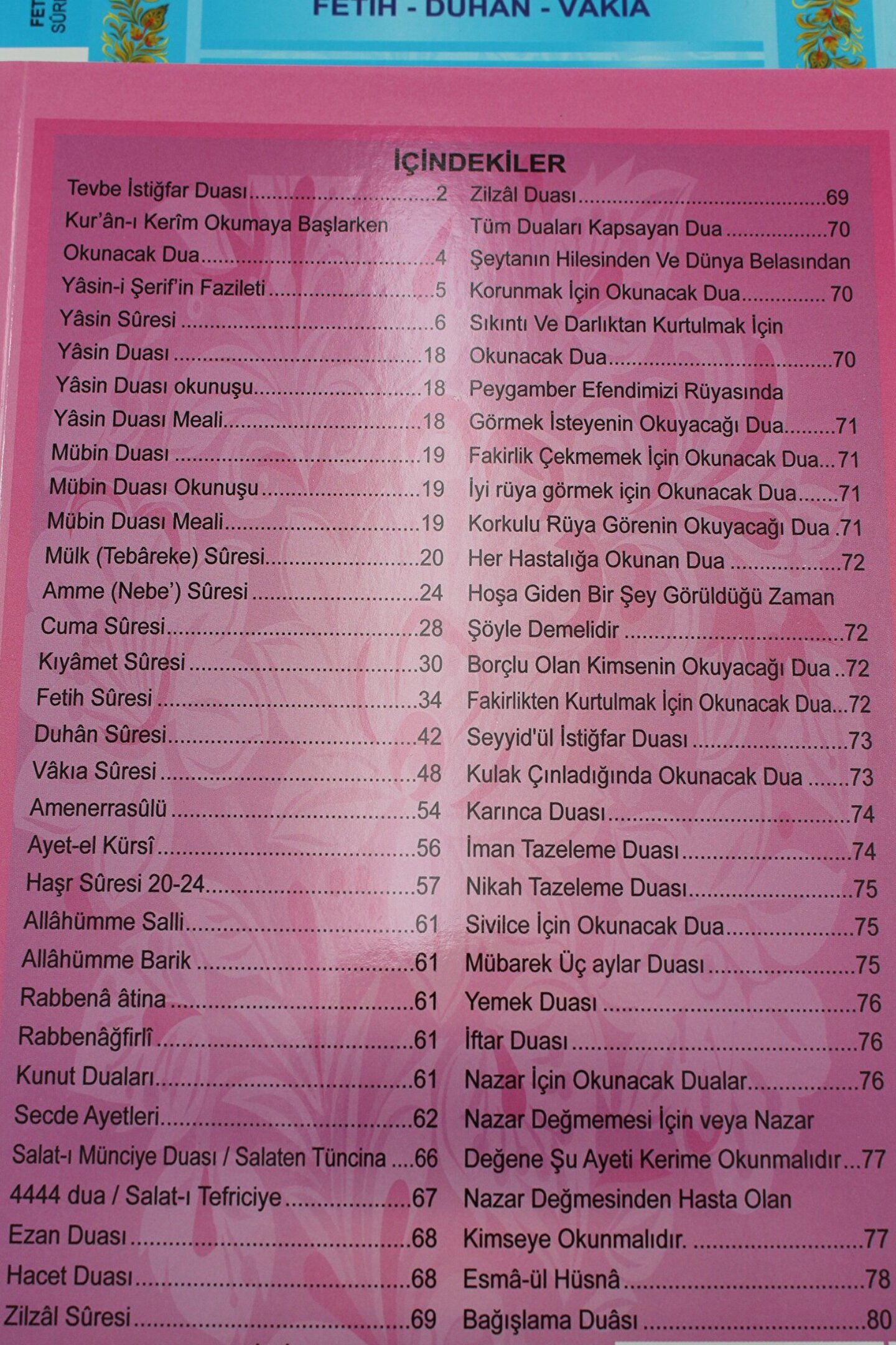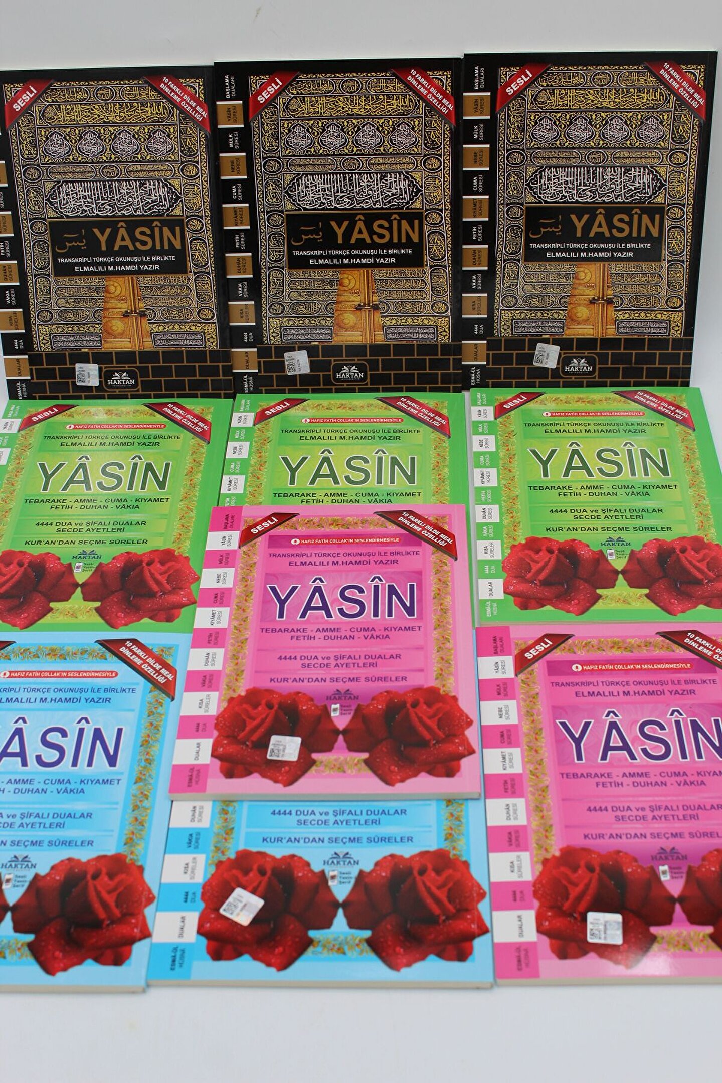 Yasini Şerif Açıklamalı ve Mealli Orta Boy Karışık Renk 10 Adet Ürün Özellikleri ; Boyut: 17x24cm ; 2. Hamur Kağıt ; Karton Kapak ; 80 Sayfa ; 2 Renk Baskı ; Diyanet Mühürlü ve Onaylıdır. ; Dünyanın en kolay okunan Bilgisayar Hattı ile hazırlandı, seçilen yazı hem estetik hem de harflerin temel karakterlerini koruyan ve kolay okunmalarını sağlayan özel bir hattır. Harekeler ait oldukları harflerin hemen altında ya da üstünde sıralanmış, özellikle okumaya yeni başlayanlar hareke karışıklıklarına meydan vermeyecek şekilde düzenlenmiştir. ;