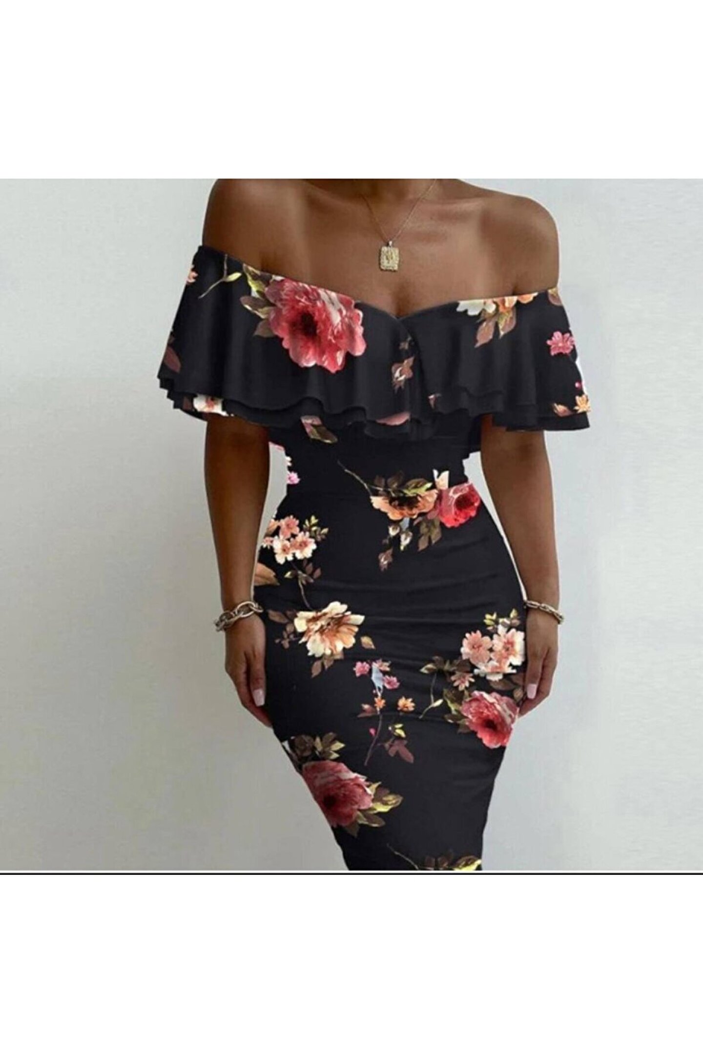Kadın Madonna Yaka çiçek Baskılı Volan Detay Kalem Elbise