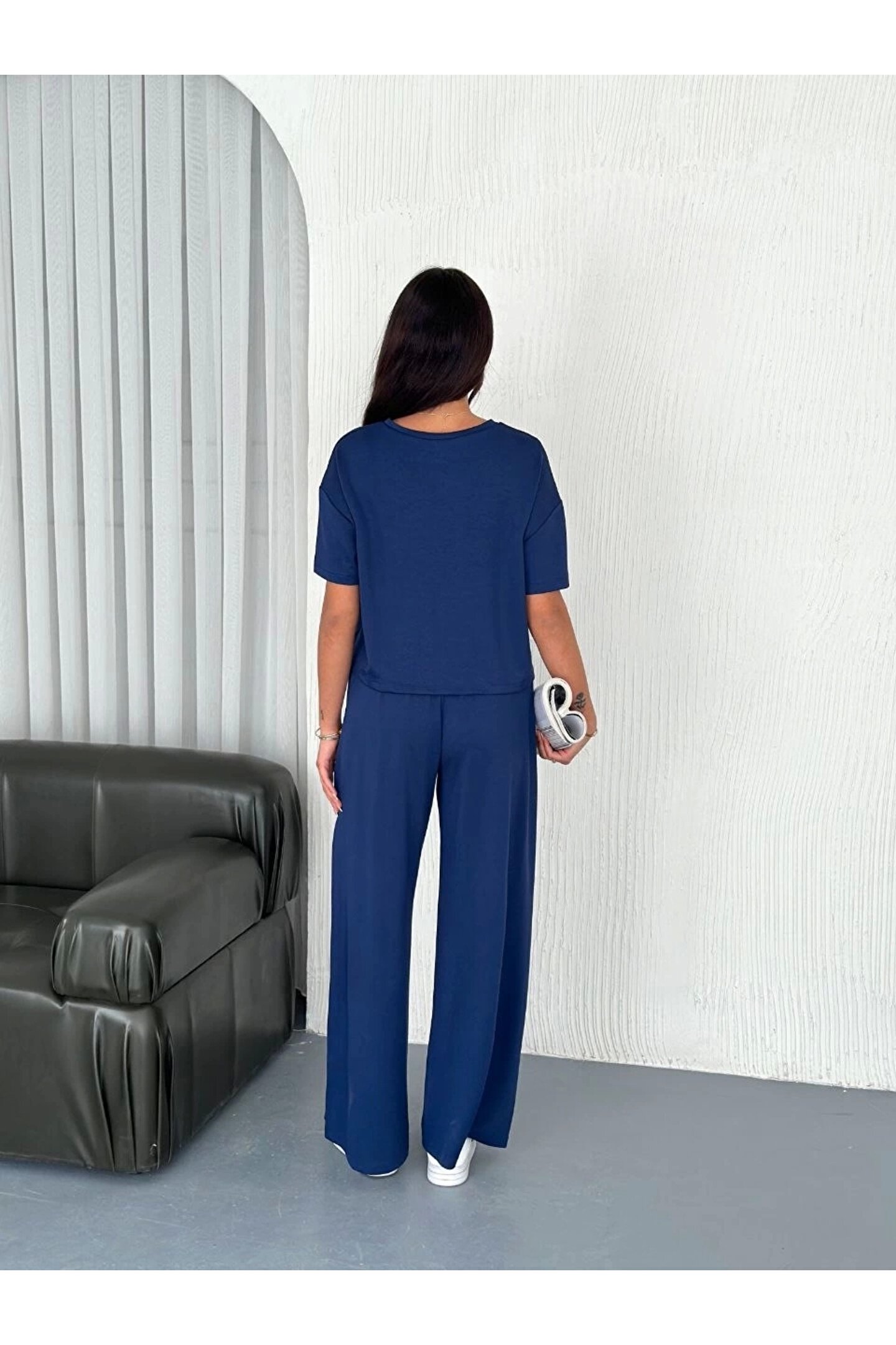 Osy Modal Yumuşak Dokulu Kumaş Bisiklet Yaka T-shirt Bol Paça Pantalon Ikili Takım -Saks Mavi