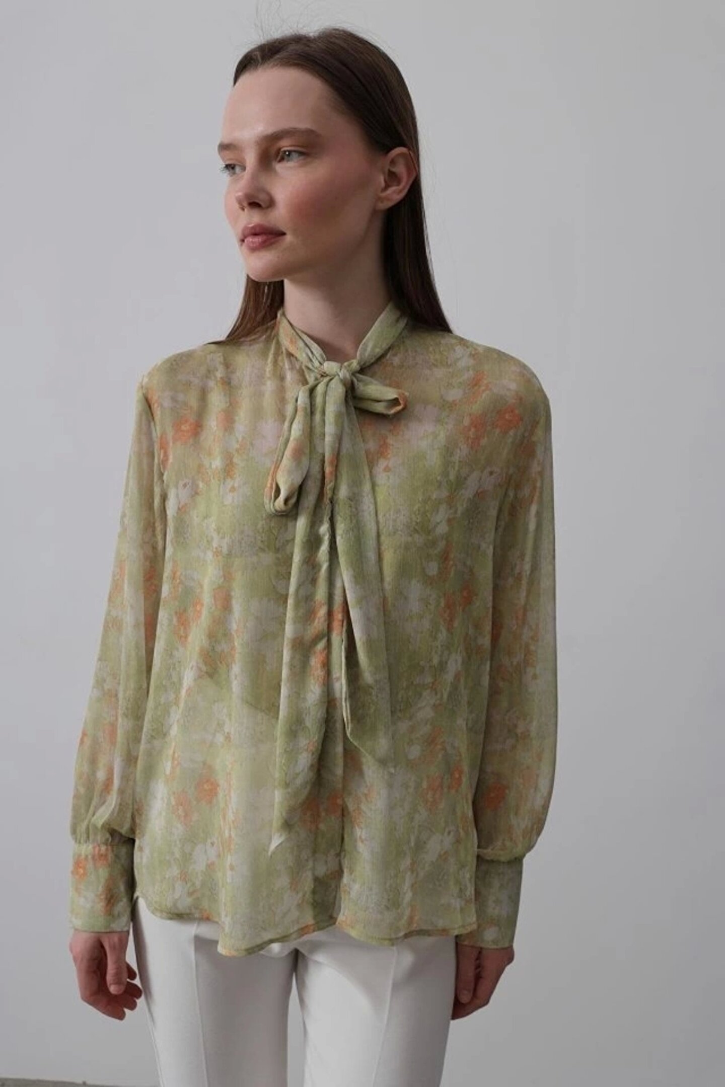 Yakası Fularlı Şifon Gömlek - Fıstık Yeşili