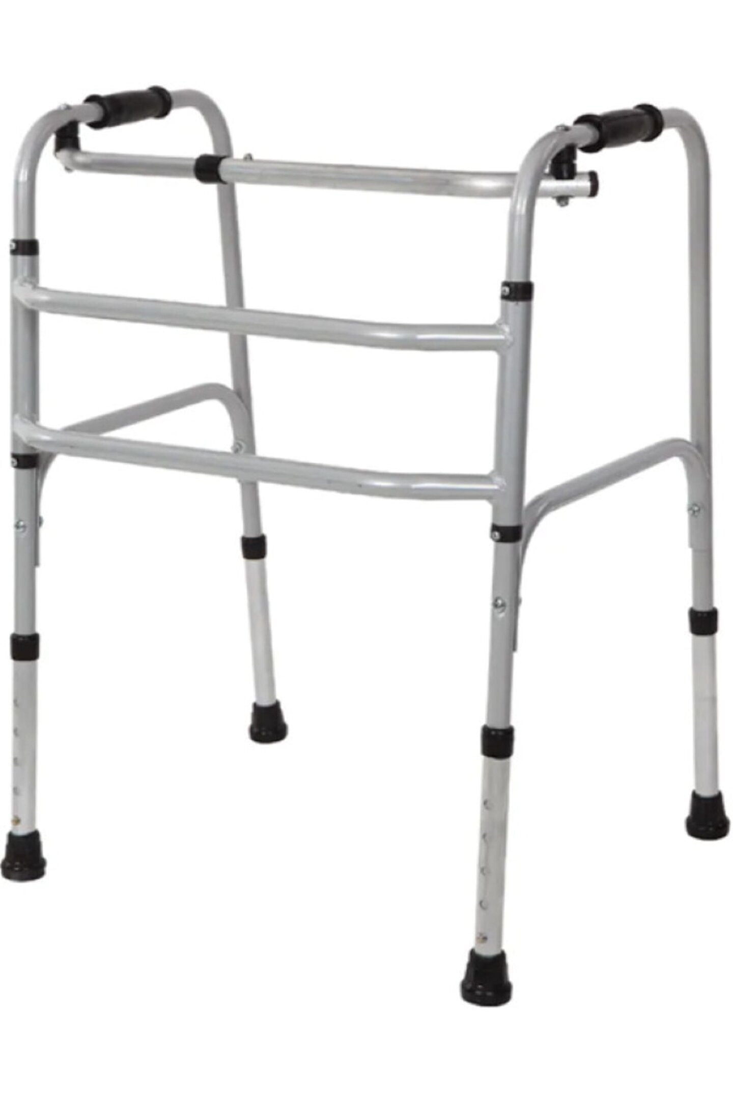 Hafif demir yapısı ile taşıma kolaylığı sağlar.; ; Dönen gövde yapısı kullanıcı ile birlikte hareket etmeye olanak tanır.; ; Yerde iz bırakmayan ve kaymayan kauçuk pabucu ile güven verir.; ; Kullanıcı tipine göre 8 kademede bacak boyu ayarlanabilir.; ; Konforlu köpük el tutamaçları ergonomik yapıdadır.; ; Tek buton ile kolayca tek elle katlanabilir.; ; Katlanma özelliği ile kolay taşıma ve depolama sağlar.; ; Yerli ürün Alüminyum Hareketli Walker Teknik Özellikleri: Malzeme Rengi :Krom ; Parçaların Rengi: Gri ; Tamamen metal borudan imal edilmiştir.; ; Dengeli bir yürüteçtir.; ; Eklemli bağlantıları sayesinde hem katlanır.; ; hem de iki ayağı kaldırılıp ileri itilerek kolay ve güvenli bir kullanım sağlar.; ; İki adet anotomik elceği vardır.; ;