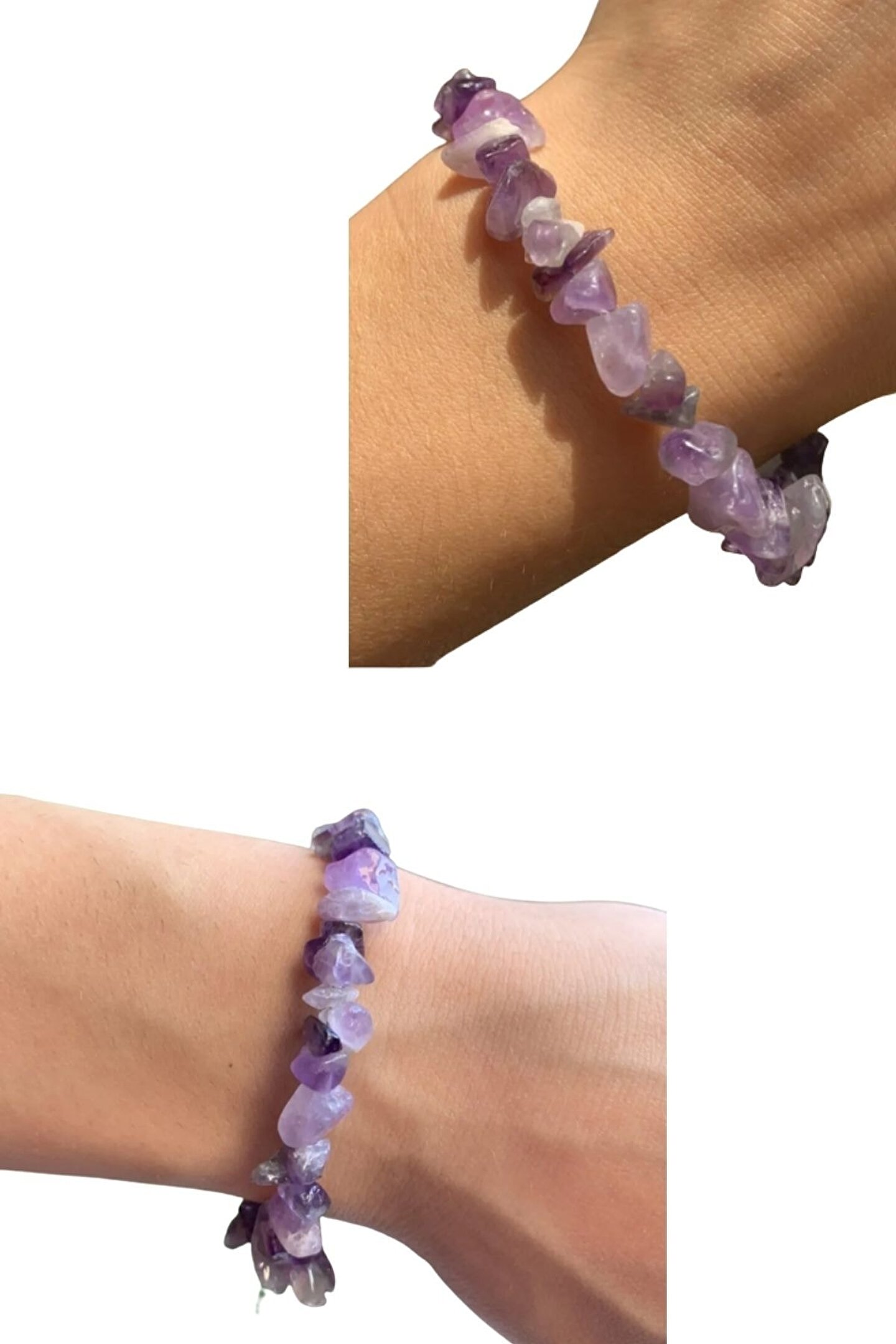 Doğal Ametist taşı kullanılarak üretilmiş, her bir bileklik benzersiz ve özgün bir tasarıma sahiptir; Ametist taşı, şıklığı ve zarafetiyle dikkat çeken bir doğal taş olup, bileklikte doğal güzelliğini ön plana çıkarır; Taşın kırıktaş formu, bilekliğe farklı bir dokunuş katarken, her parça eşsiz bir görünüm sunar; Doğal taş materyali sayesinde hem dayanıklılık hem de estetik bir görünüm sağlar; uzun süreli kullanım için idealdir;