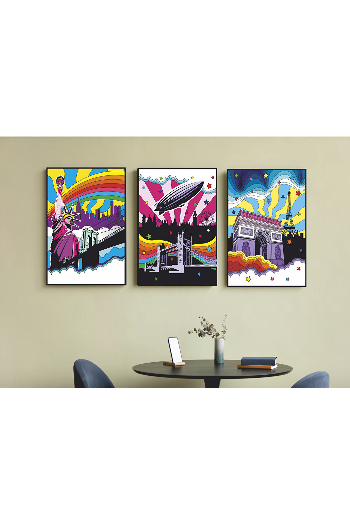- Çerçevesiz tasarımı ile mekanınıza modern ve minimalist bir dokunuş katıyor.; - Retro tema ve stil anlayışıyla, eski moda estetiği evinizin dekorasyonuna taşıyor.; - Üretiminde yerli malzeme kullanılarak sürdürülebilirlik ve kalite ön planda tutuluyor.; - Üç parçadan oluşan set, farklı şehirlerin ikonik yapılarını göz alıcı bir şekilde sergiliyor.; - New York'tan Amerika'ya, Londra'dan İngiltere'ye, Paris'ten Fransa'ya uzanan bu tablolarla dünya kültürlerini evinizde hissedin.