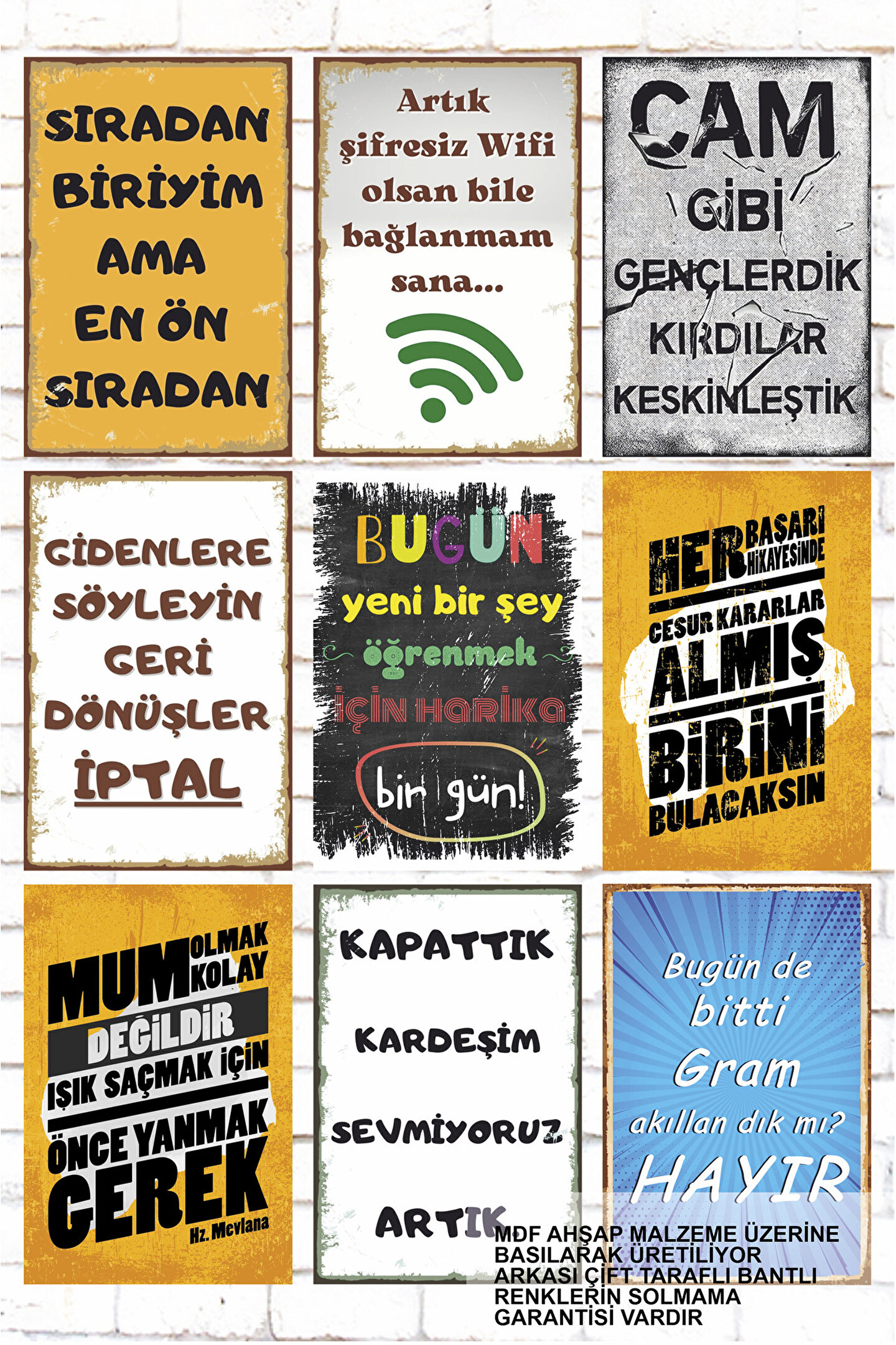 - Çerçevesiz tasarımı ile kolayca duvara asılabilir ve mekanınıza modern bir dokunuş katar.- Türkiye menşeli malzemeler kullanılarak üretilmiş olup, yerel kaynakların desteklenmesine katkıda bulunur.- İlham verici sözlerle dolu bu set, evinizin veya ofisinizin atmosferini zenginleştirirken aynı zamanda eğlenceli bir hava yaratır.- Kaliteli MDF materyali sayesinde uzun ömürlü kullanım sunar ve dayanıklılığıyla ön plana çıkar.- Toplamda 9 parça içeren bu set, farklı alanlarda çeşitli kombinasyonlar oluşturmanıza olanak tanır.