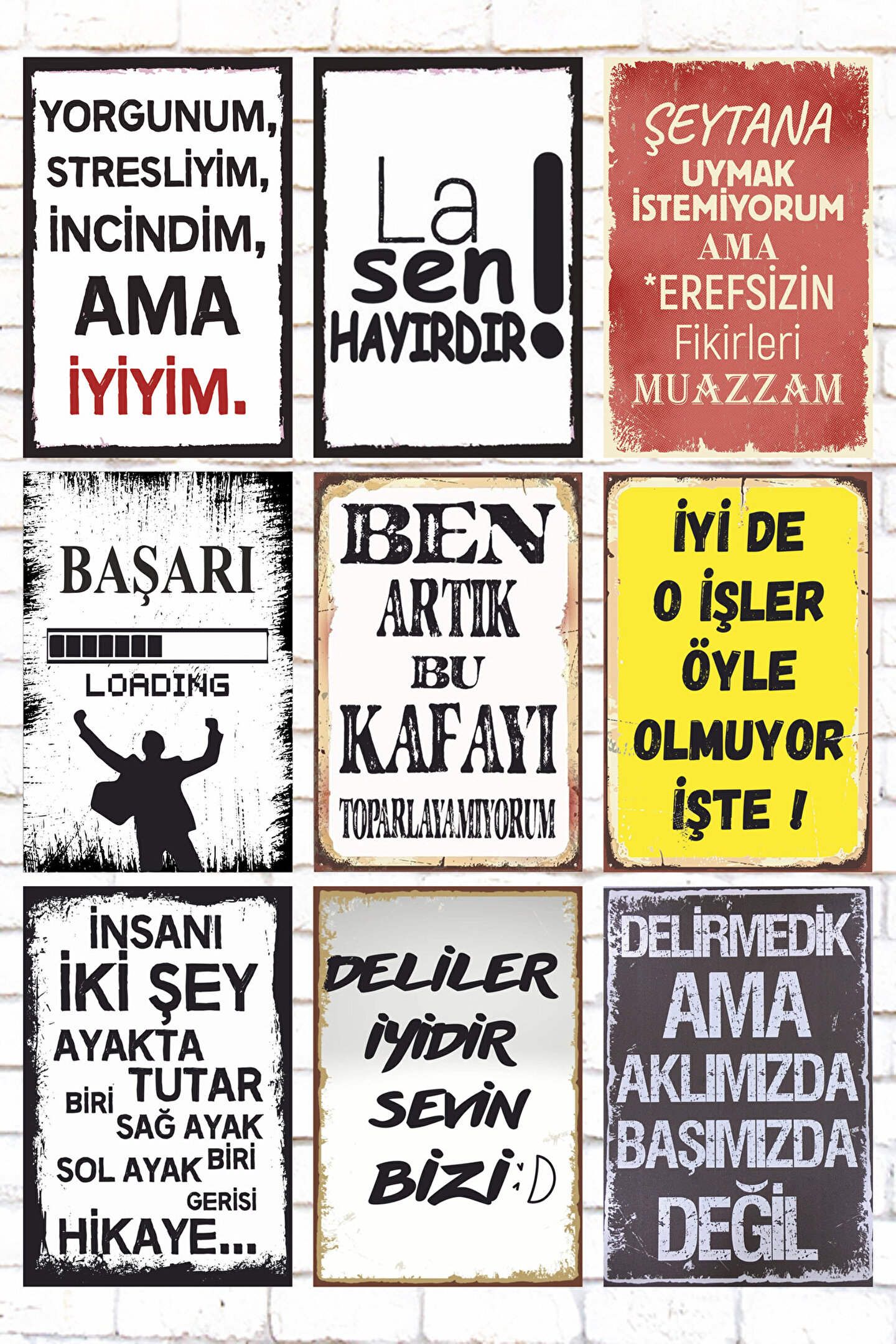 - Retro tarzıyla dikkat çeken 9 parçalık ahşap tablo seti, evinizin dekorasyonuna nostaljik bir dokunuş katıyor.- Komik ve esprili yazılardan oluşan bu set, mizah dolu anlarınıza eşlik edecek.- Her parça ayrı ayrı kullanılabilir veya bir araya getirerek büyük bir tablo oluşturabilirsiniz; böylece kişisel zevkinize göre özelleştirebilirsiniz.- Çerçevesiz tasarımı sayesinde duvara kolayca asılabilir ve istediğiniz herhangi bir yüzeye uyum sağlar.- Tamamen yerli üretim olan bu ürün, kaliteli malzemelerden üretilmiştir ve uzun ömürlü kullanım vaat eder.