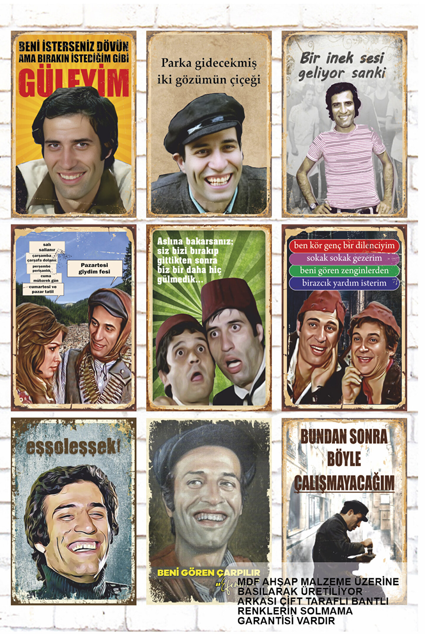 - Türk sinemasının unutulmaz anlarını yansıtan 9 parçadan oluşan ahşap tablo seti, evinizin dekorasyonuna nostaljik bir dokunuş katıyor.- Yeşilçam'ın efsanevi oyuncusu Kemal Sunal'ın yer aldığı bu setteki her parça, sevilen filmlerin özgün repliklerini taşıyor.- Retro tarzıyla dikkat çeken bu tablolar, MDF materyalden üretilmiş olup dayanıklılığı ile uzun süreli kullanım vaat ediyor.- Çerçevesiz tasarımı sayesinde duvarlarınızda kolayca asılabilir ve istediğiniz şekilde düzenleyebilirsiniz.