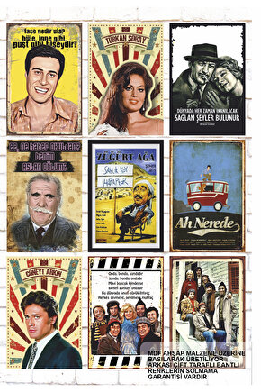 - Türk sinemasının efsanevi isimlerini ve unutulmaz repliklerini yansıtan 9 parçalık ahşap tablo seti, evinizin dekorasyonuna nostaljik bir dokunuş katıyor.- Çerçevesiz tasarımı sayesinde duvarlarınızda kolayca asılabilir ve istediğiniz herhangi bir alanda estetik bir görünüm sağlar.- Retro teması ile geçmişin izlerini taşıyan bu set, Yeşilçam'ın büyüsünü yaşamak isteyenler için idealdir.- Yüksek kaliteli MDF materyali kullanılarak üretilmiş olup uzun ömürlü kullanım sunar.- Her bir parça ayrı ayrı seçilebilir veya tam bir koleksiyon olarak sergilenebilir; böylece kişisel zevkinize göre özelleştirebilirsiniz.