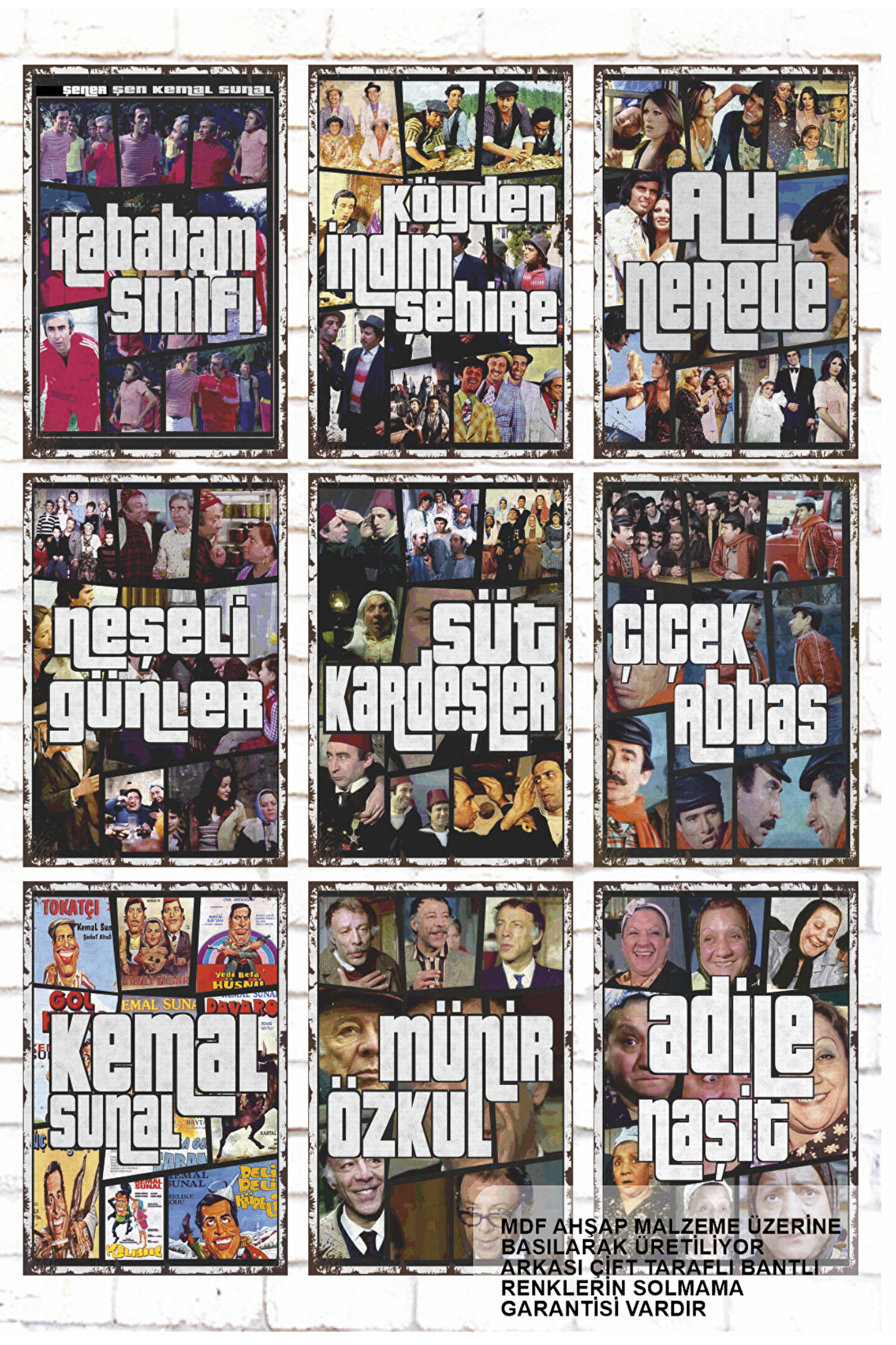 - Türk sinemasının unutulmaz filmlerini yansıtan 9 parçalık ahşap tablo seti, evinizin dekorasyonuna nostaljik bir dokunuş katıyor.- Retro tasarımıyla dikkat çeken bu set, Yeşilçam'ın efsanevi oyuncularını ve filmlerini anımsatan posterlerle dolu.- Yüksek kaliteli MDF malzemeden üretilmiş olan bu çerçevesiz tablolar, dayanıklılığı ve uzun ömürlü kullanımı ile ön plana çıkıyor.- Her bir parça, Türk sinemasının farklı dönemlerinden seçilmiş klasik filmleri temsil ediyor; böylece koleksiyonunuzda zengin bir çeşitlilik bulunuyor.- Çerçevesiz yapısı sayesinde kolayca duvara asılabilen veya masanızda sergilenebilen bu tablolar, mekanınızda şık bir atmosfer oluşturuyor.