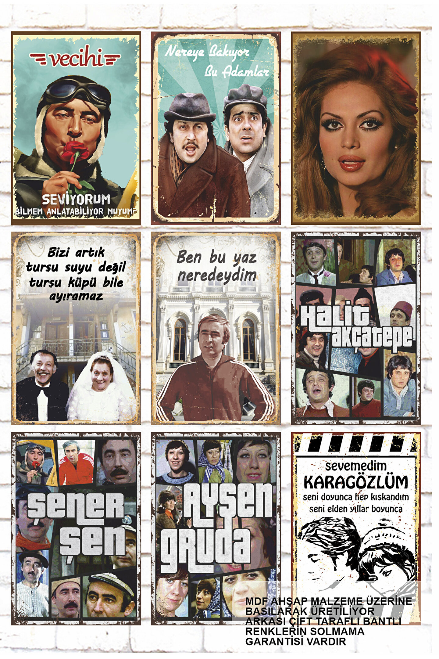 - Türk sinemasının unutulmaz oyuncularını ve filmlerini yansıtan 9 parçalık ahşap tablo seti, evinizin dekorasyonuna nostaljik bir dokunuş katıyor.- Retro tasarımıyla dikkat çeken bu tablolar, MDF malzemesinden üretilmiş olup dayanıklılığı ve uzun ömürlü kullanımı ile ön plana çıkıyor.- Çerçevesiz tasarımı sayesinde duvarlarınızda istediğiniz şekilde sergileyebilir veya farklı dekorasyon fikirleriyle uyum sağlayabilirsiniz.- Yeşilçam'ın efsanevi oyuncularının ve filmlerinin yer aldığı bu set, Türk sinemasının zengin mirasını evinizde yaşatmanız için idealdir.