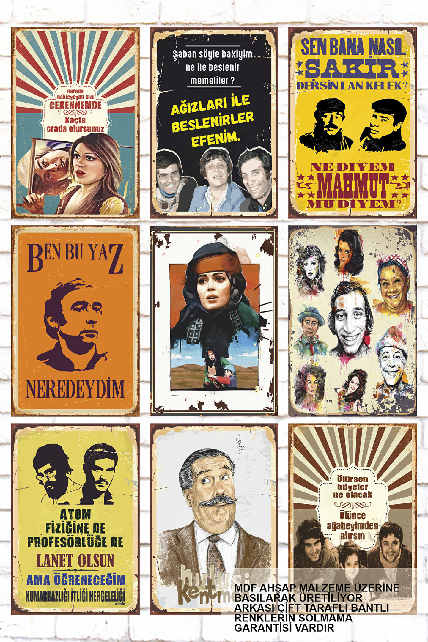 - Yeşilçam Türk Sineması'nın ikonik portreleri ve sahnelerini yansıtan 9 parça ahşap tablo seti, evinizin dekorasyonuna nostaljik bir dokunuş katıyor.- Retro tarzıyla dikkat çeken bu tablolar, MDF materyalden üretilmiş olup dayanıklılığı ve estetik görünümüyle öne çıkıyor.- Çerçevesiz tasarımı sayesinde duvarlarınızda kolayca asılabilir ve istediğiniz herhangi bir alanda kullanabilirsiniz.- Her bir parçasında farklı bir karakter veya sahne yer aldığından, koleksiyonunuzda zenginleştirici bir etki yaratır.- Yeşilçam'ın klasik filmlerinden seçilmiş repliklerle süslenmiş bu tablolar, hem sanatsal değeri hem de eğlenceli anıları barındırıyor.