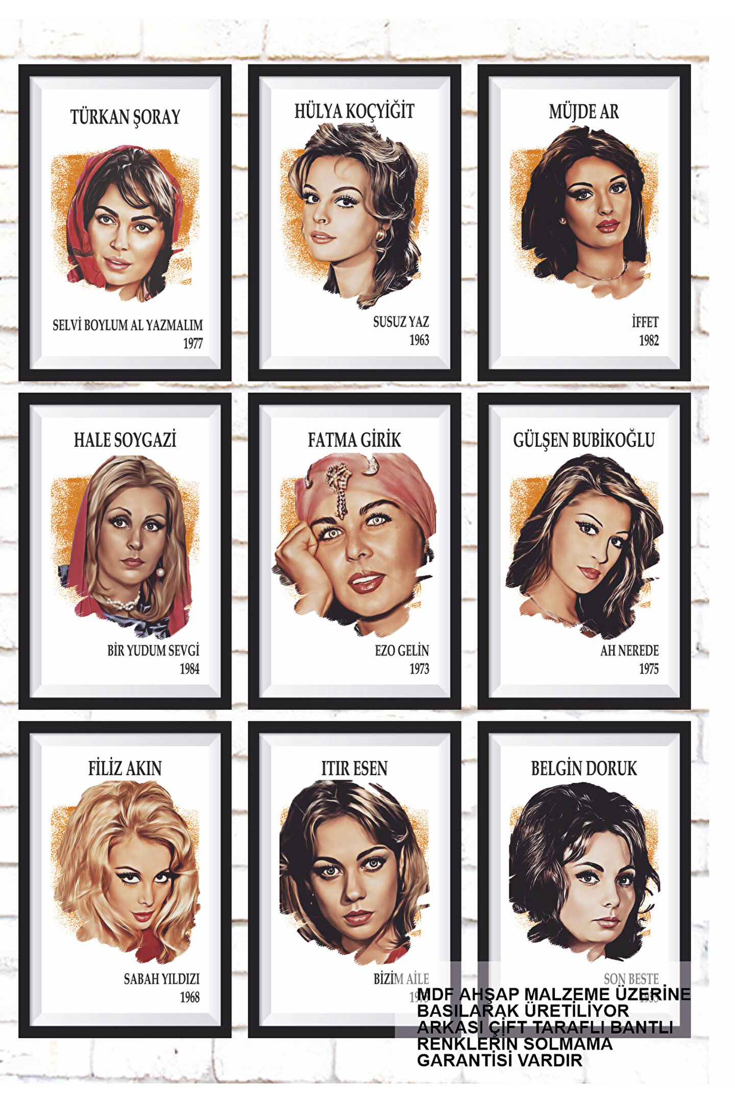 - Retro tarzıyla nostaljik bir atmosfer yaratan, Türk sinemasının sevilen kadın oyuncularını konu alan 9 parçalık ahşap tablo seti.- Her biri özenle seçilmiş ve çerçevesiz tasarlanmış bu posterler, duvarlarınızda şık bir görünüm oluştururken aynı zamanda kolayca asılabilir.- Yüksek kaliteli MDF malzemeden üretilmiş olup, uzun süreli kullanım için dayanıklılık sunar.- Yeşilçam'ın unutulmaz güzelliklerini yansıtan bu set, evinizin veya ofisinizin dekorasyonuna zarif bir dokunuş katar.