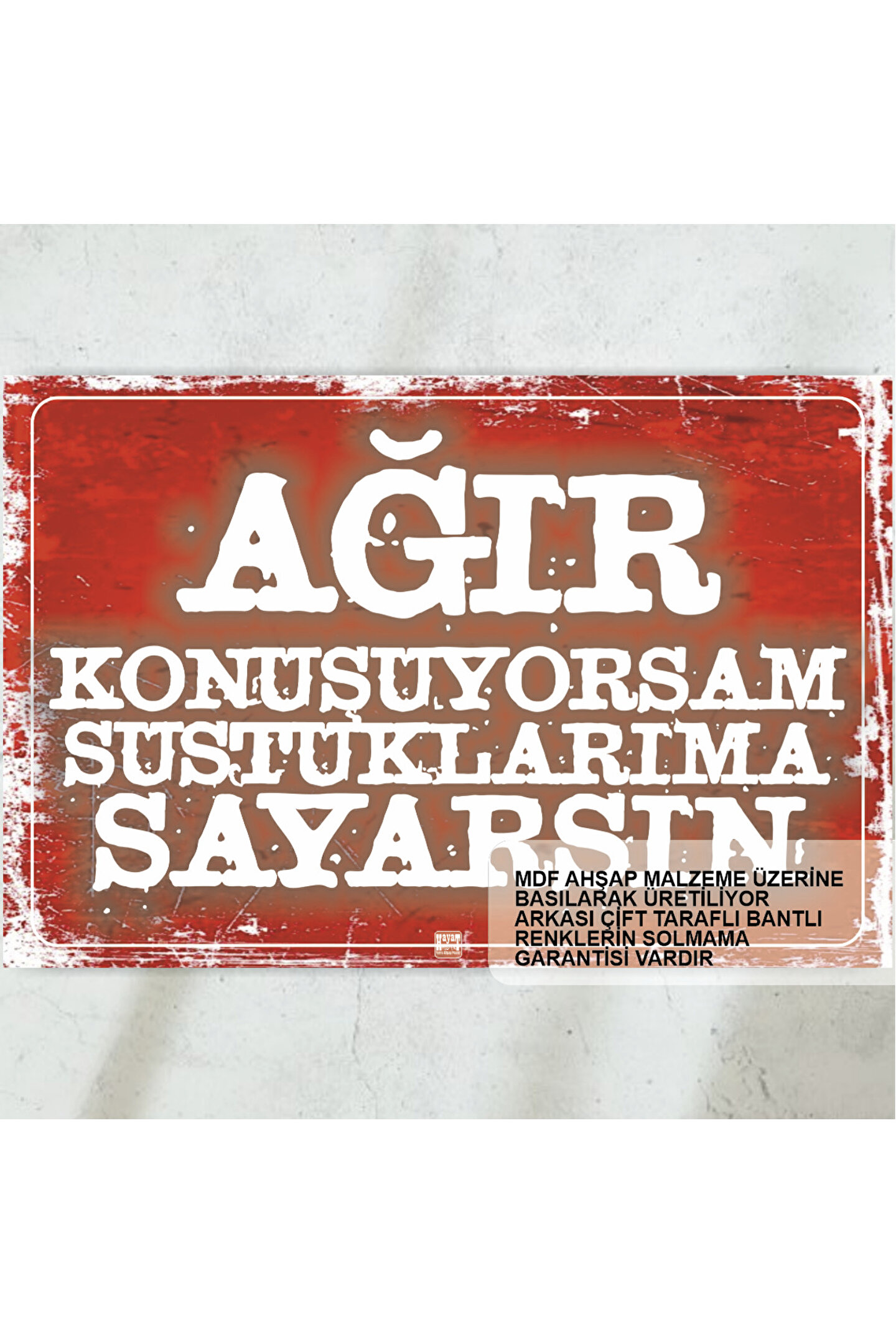- Retro tasarımıyla dikkat çeken bu ahşap poster, evinizin veya ofisinizin dekorasyonuna nostaljik bir dokunuş katıyor.; - Sadece bir parça olarak sunulan bu ürün, kolayca asılabilir ve mekanınıza uyum sağlayacak şekilde tasarlanmıştır.; - Ağır konuşan insanları susturmak için ideal olan bu espri dolu sözlerle, hem eğlenceli hem de düşündürücü anlar yaşatabilirsiniz.; - Çerçevesiz yapısı sayesinde duvara zarar vermeden rahatlıkla asılabilir; böylece herhangi bir ekstra aksesuar gerektirmeden kullanabilirsiniz.; - Türkiye'de üretilmiş olmasıyla yerel sanatçıların yeteneğini yansıtan bu poster, kalite ve dayanıklılığı ile ön plana çıkıyor.