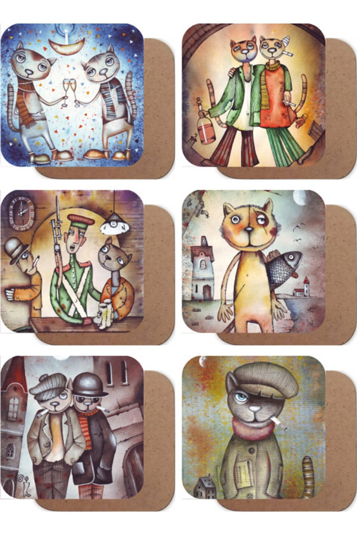 Ahşap malzeme kullanımı sayesinde dayanıklı ve uzun ömürlü bir kullanım sunar; Kedi illüstrasyonları ile dekoratif bir görünüm kazandırarak mutfak dekorasyonunuza şıklık katar; 6 adet bardak altlığı seti, birden fazla bardağı aynı anda destekleyebilme imkanı sağlar; Ahşap yapısı ile doğal bir dokunuş sunarak mutfakta sıcak bir atmosfer yaratır;
