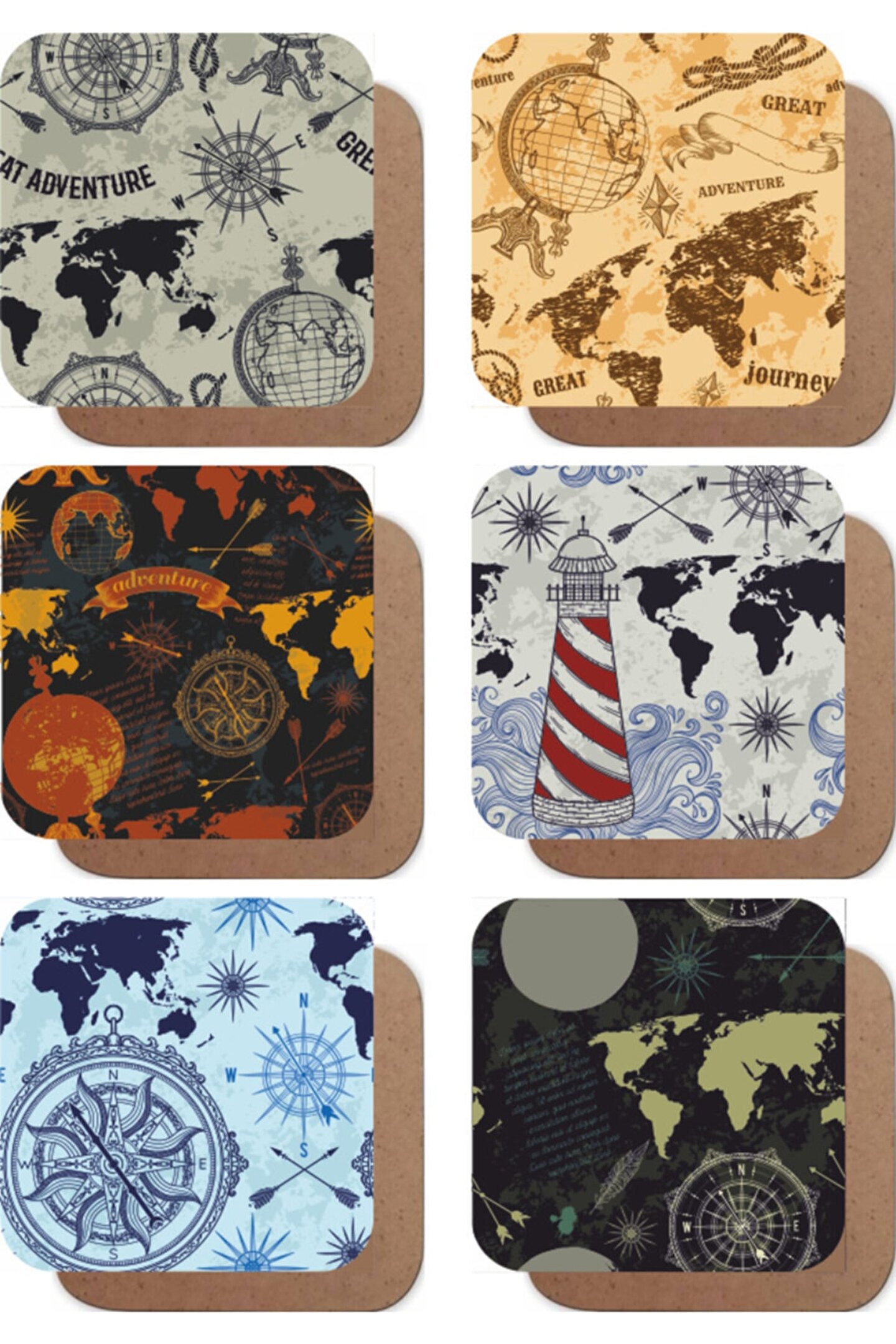 Hayat Poster Dünya Haritası Atlas Temalı 6lı Retro Ahşap Bardak Altlığı Seti