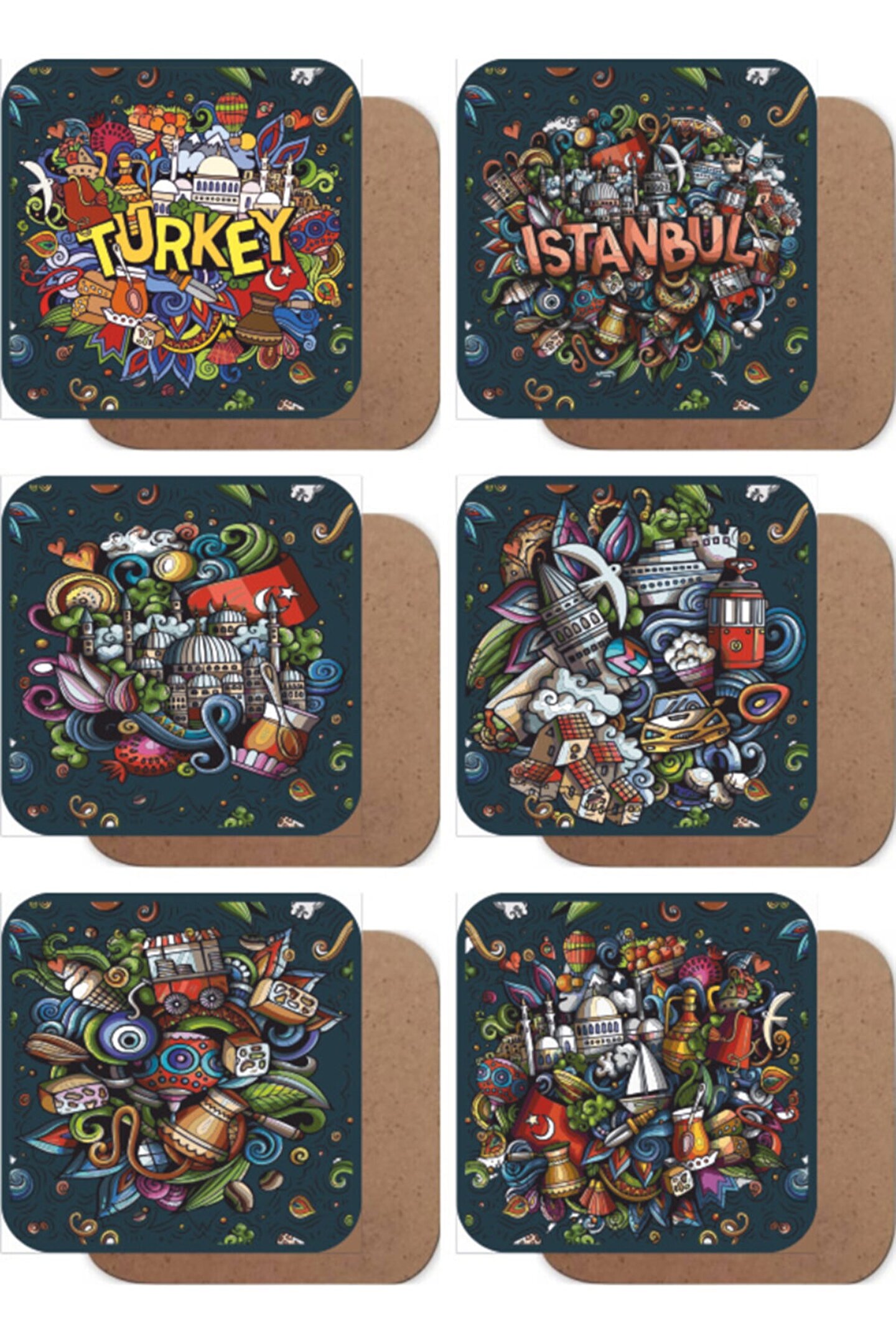 Sette 6 adet bardak altlığı bulunmaktadır, bardaklarımız MDF üzerine UV baskıdır, asla çizilmez rengi solmaz her bir bardak altlığının ebatı 9 cm x 9 cm'dir hayat poster farkıyla