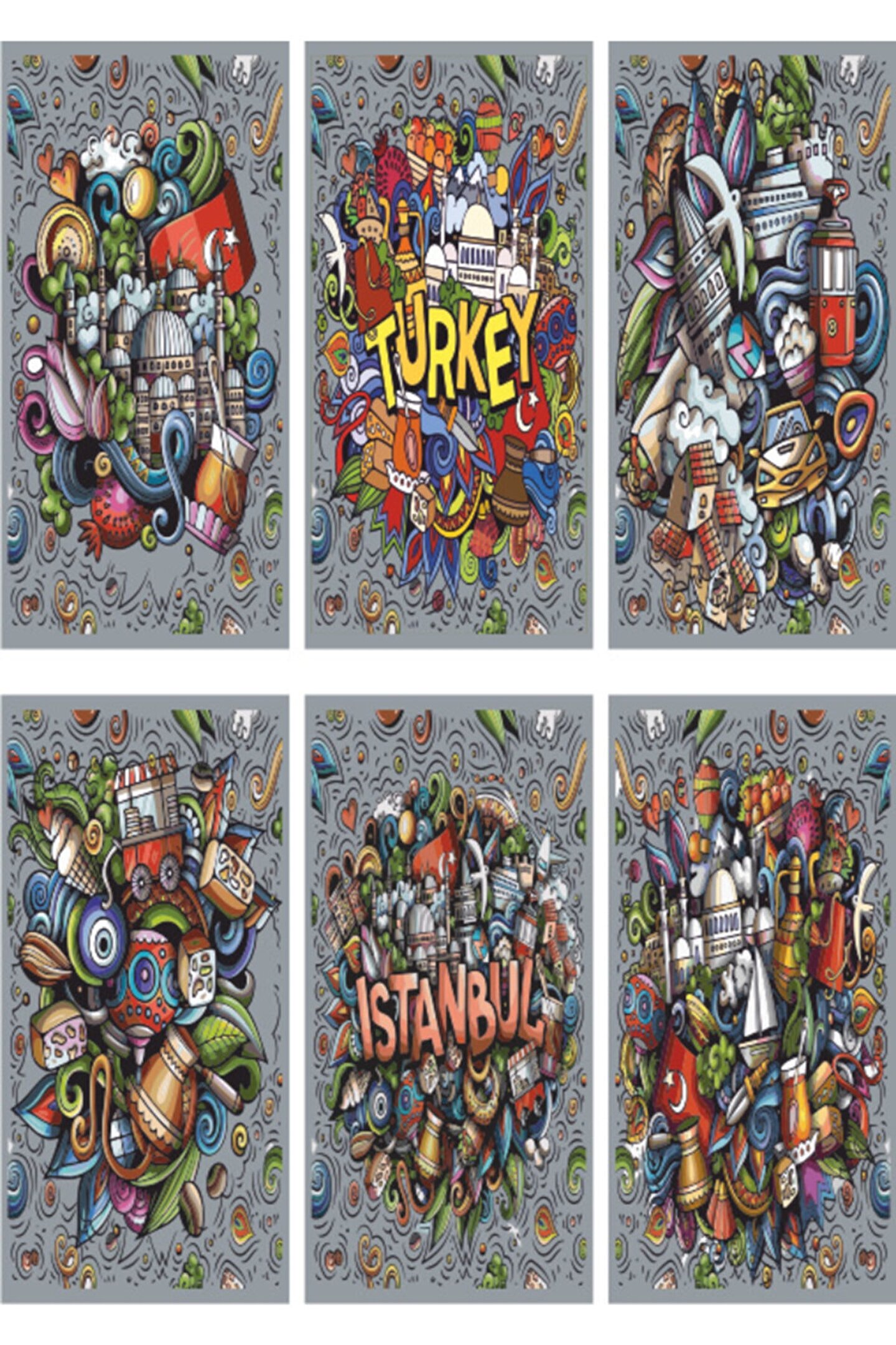 Hayat Poster Istanbul Türkiye El Çizimi 6lı Mini Retro Ahşap Poster Seti Uv Baskılı